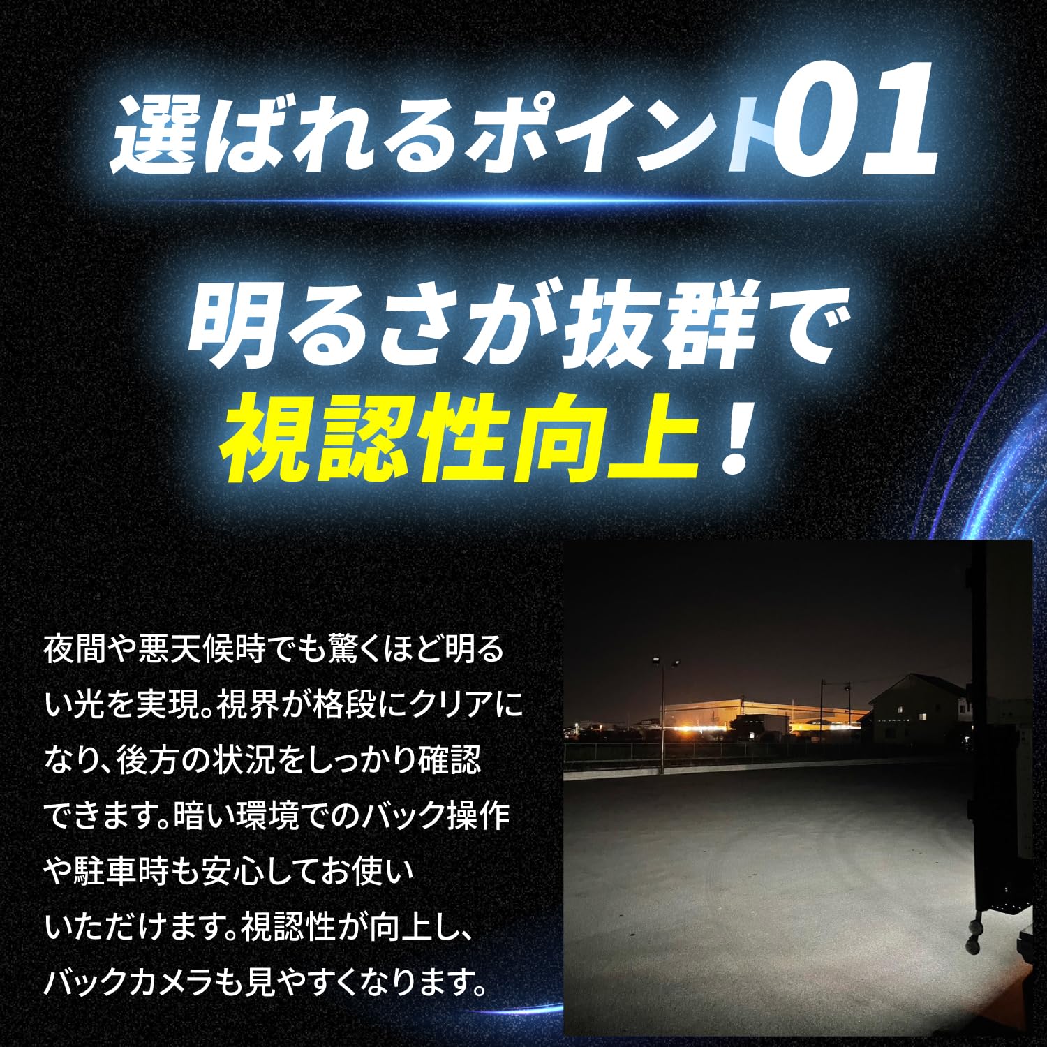 ?【 明るさが抜群で視認性向上!】 夜間や悪天候時でも驚くほど明るい光を実現。視界が格段にクリアになり、後方の状況をしっかり確認できます。 暗い環境でのバック操作や駐車時も安心してお使いいただけます。視認性が向上し、バックカメラも見やすくなります。