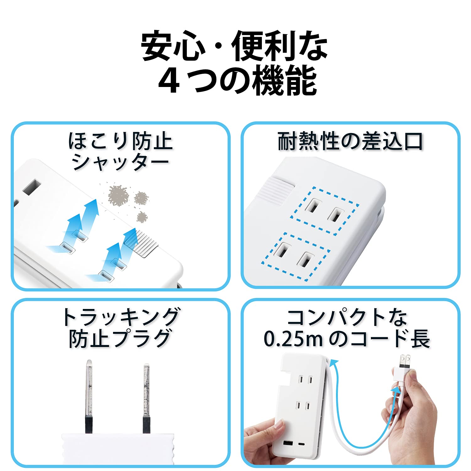 エレコム 電源タップ USB ケーブル収納 15W コンセント×3個口 USB-A×1ポート USB-C×1ポート ホワイト ECT-1802WH