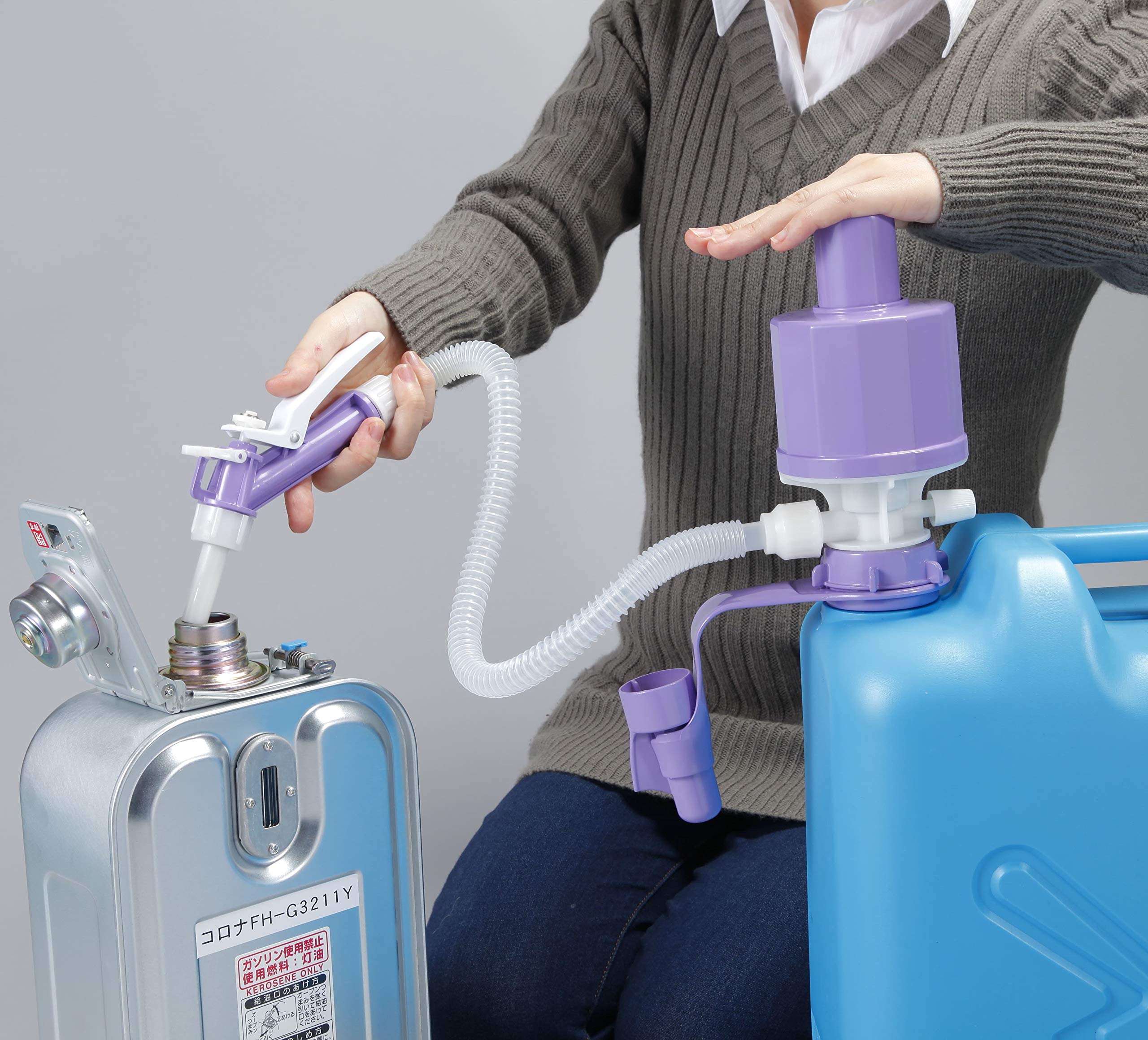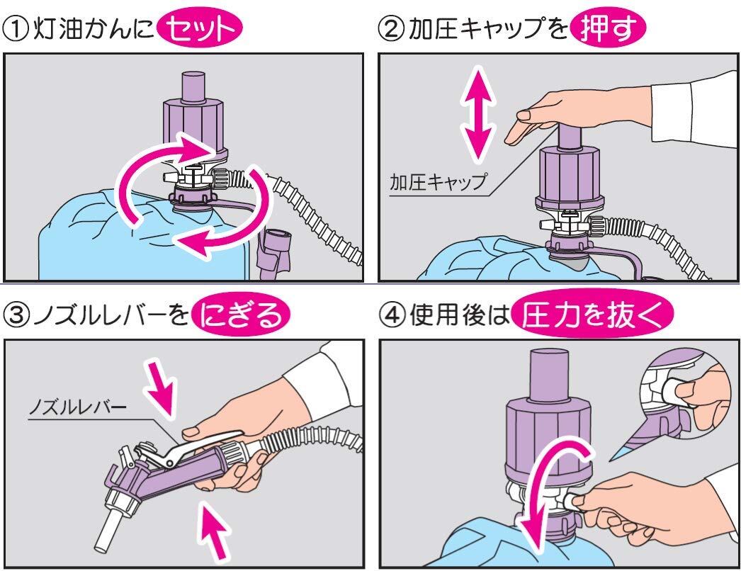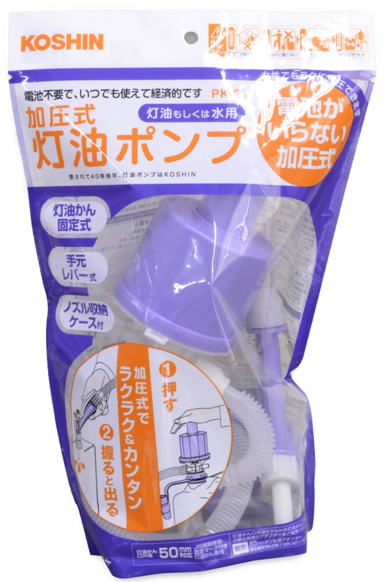 工進(KOSHIN) 加圧式 灯油ポンプ ポリオート PK-21 電池 不要 ガンノズル 雫垂れ 低減 非常時 緊急時 備え 電池不要。経済的給油ポンプ。 6リッターのカートリッジタンクへ約1分で給油します。 女性でもラクに加圧出来ます。 便利なノズル収納ケース付き。 18リットルポリ缶専用です。 使用液:灯油・水(飲用水にはご使用出来ません) 吐出量6㍑/分