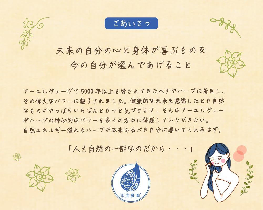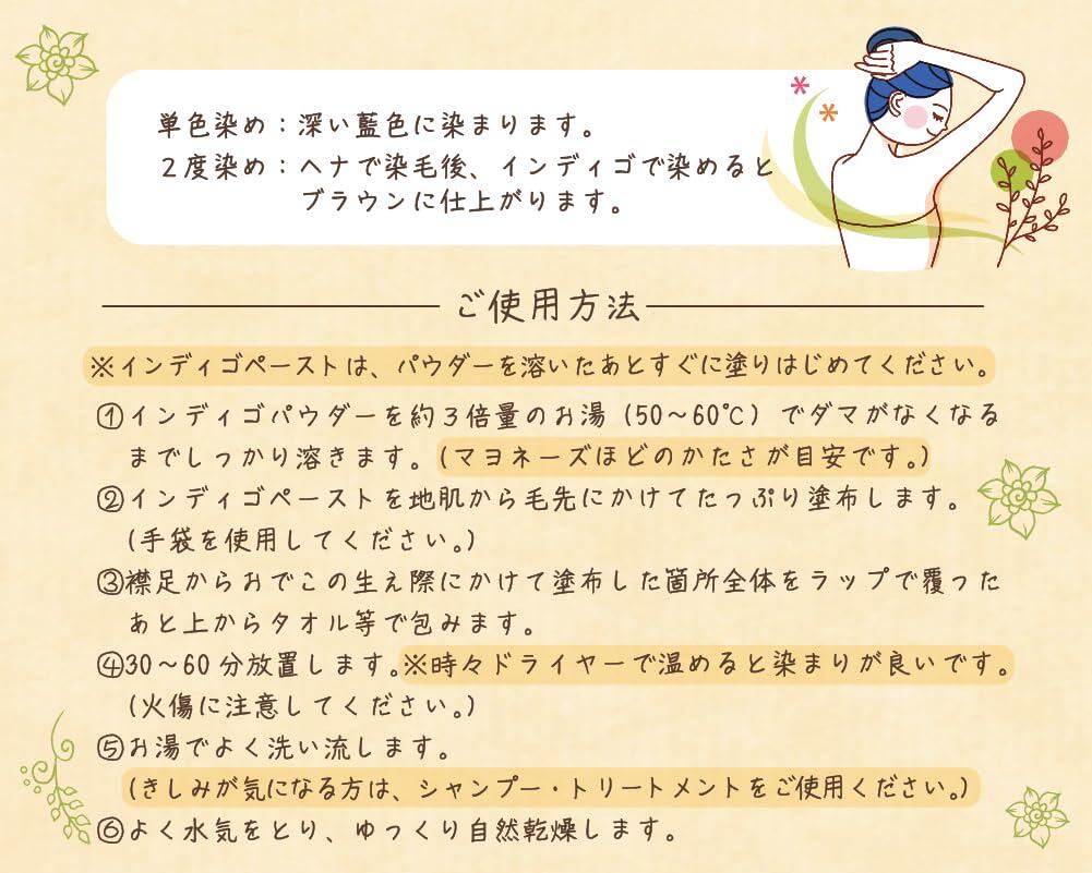 ●オーガニックインディゴ(ナンバンアイ葉)の天然染料です。印度農園100%オーガニックヘナの後に二度染め用としてご使用ください。40〜60分程度の時間で自然なブラウン色に発色します