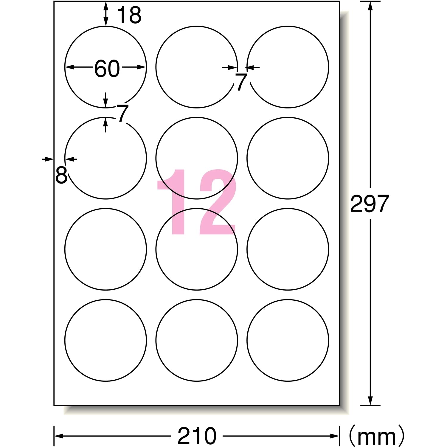 【製品情報】シートサイズ: A4判 (210mm×297mm) / 色: ホワイト / 質感: 光沢紙 / ラベルサイズ: 直径60mm (3列×4段) 12面 / 入り数: 30シート (360枚分) / ラベル厚み: 0.12mm