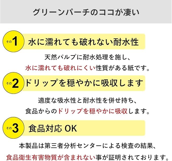 ??生々しさを軽減!耐水紙グリーンの濃緑色は顔料を使用しており、包まれる食品等へ色移りはありません。また、鮮魚のドリップを吸収した時に黒く見え(緑と赤は反対色)生々しさを軽減する効果があります。
