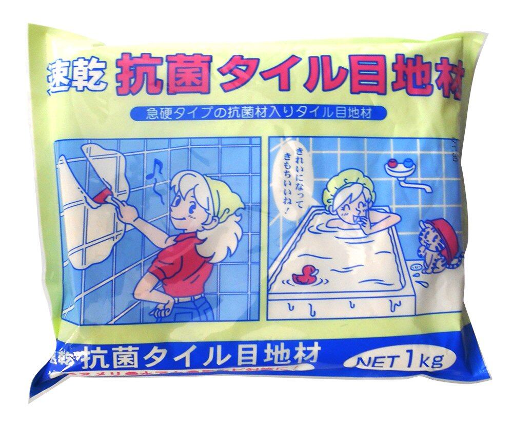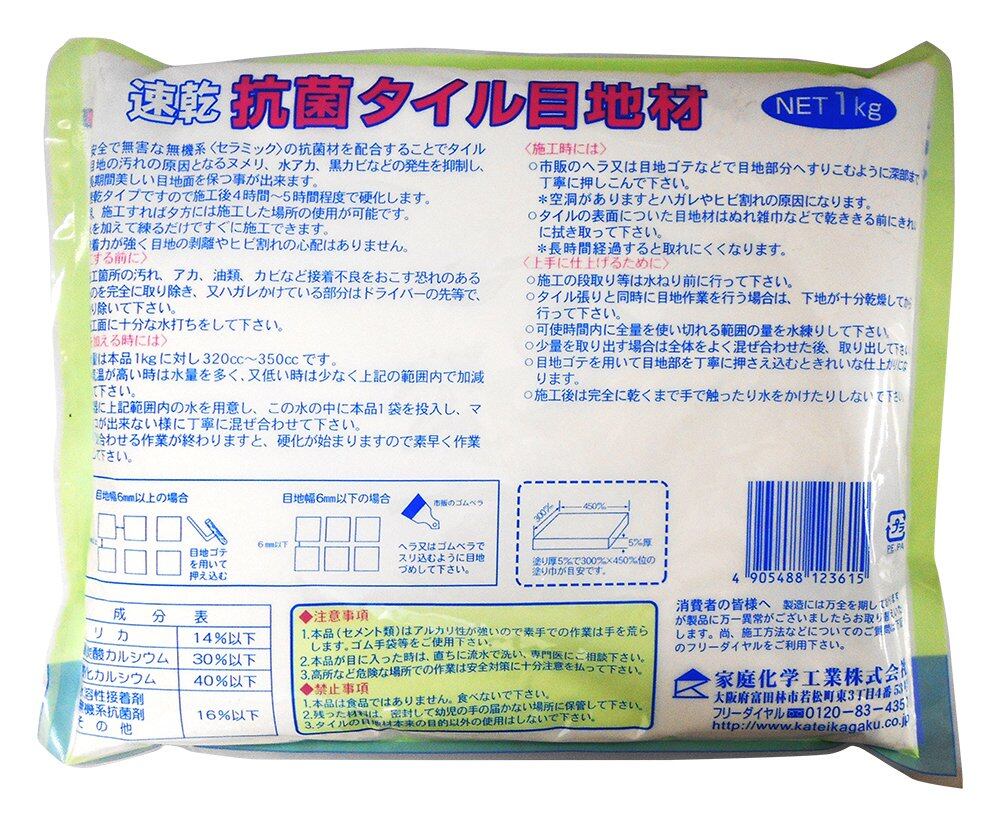 家庭化学 速乾抗菌タイル目地材 ホワイト 1kg 色目:ホワイト 成分:ポルトランドセメント、砂、その他 硬化時間:約5時間 施工面積:5mm厚×約300mm×450mm 無機系セラミック抗菌剤配合 【特長】 ●急硬タイプ ●無機系セラミック抗菌剤配合