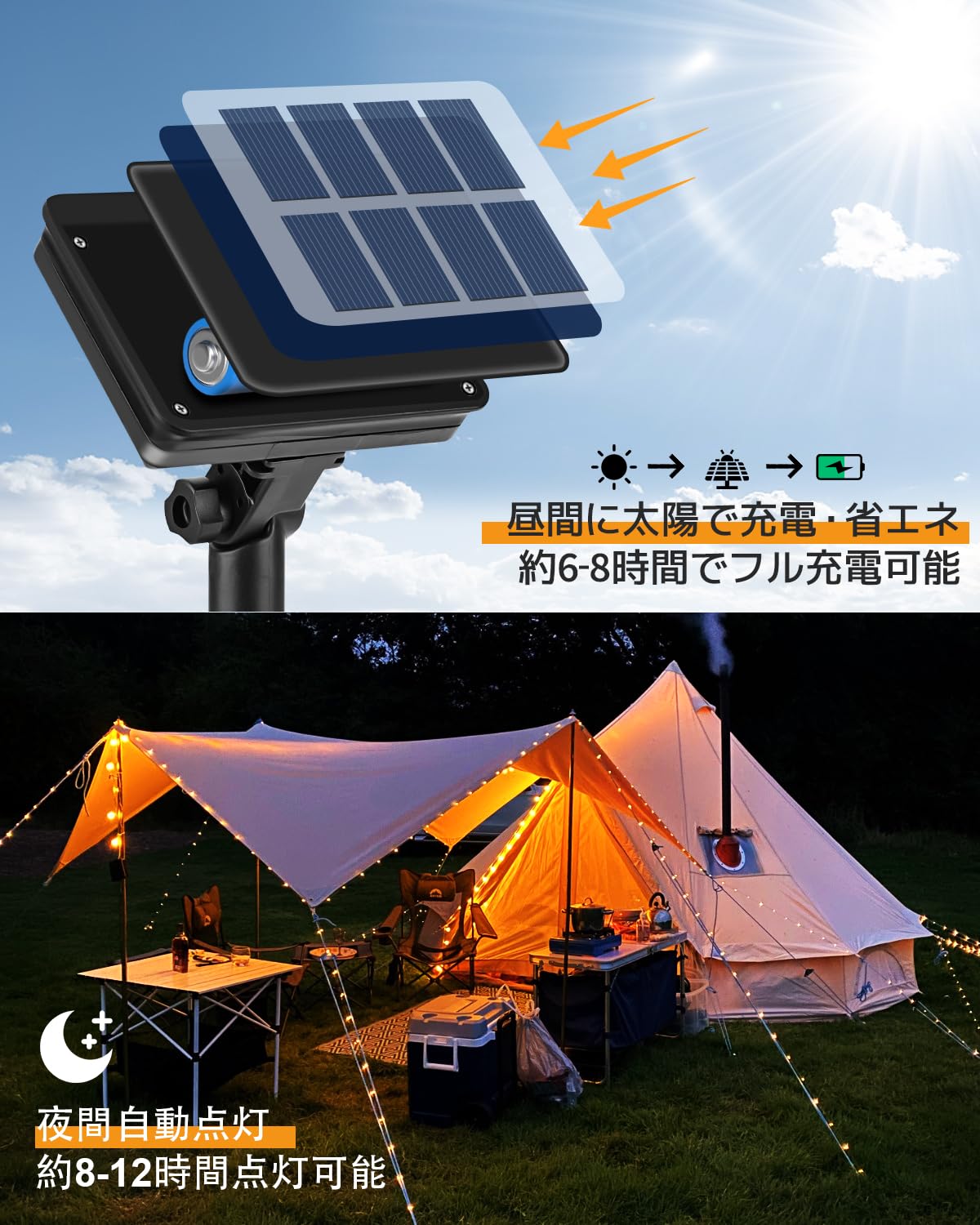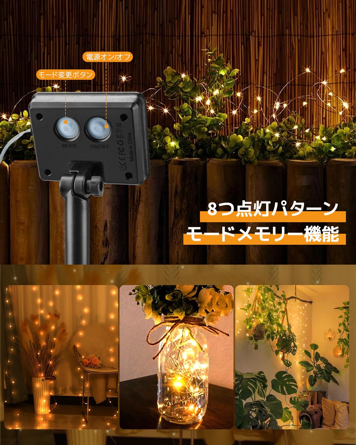 【進化したソーラーパネル・長時間点灯】このLEDストリングライトのソーラーパネルは、従来のソーラー イルミネーションライトを遙かに凌駕します。当社のパネルは、電源がオンであろうとオフであろうと、太陽光を浴びるだけで自動的に充電します。これは、従来のパネルとは全く異なる機能です。さらに、ソーラーパネルの面積を36cm2から45cm2に拡大し、ソーラー変換率を18%から驚異の22%に引き上げました。そして、内蔵バッテリーの容量を600mAhから800mAhにアップグレードし、一度のフル充電(約6-8時間必要)で約8-12時間(点灯モードにより異なります)もの長時間点灯を実現します!これほどパワフルで便利なLEDストリングライト、ぜひご実感ください!