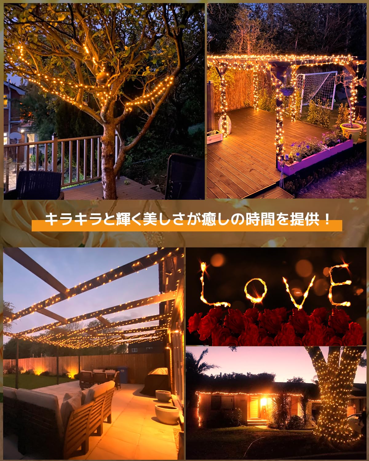 【高輝度LEDイルミネーション】Dalugoのソーラー LED ストリングライトは、高輝度ビーズを採用し、より一層明るく、美しく輝きます。暖色系のLEDライトは色が濃く、落ち着いたライティングを提供し、周囲の雰囲気を一層引き立てます。このソーラーライトがあれば、普通の夜が一瞬にしてキラキラと輝く特別な時間に変わります。LED イルミネーションライトで、あなたの大切な空間を最高のものにしましょう。