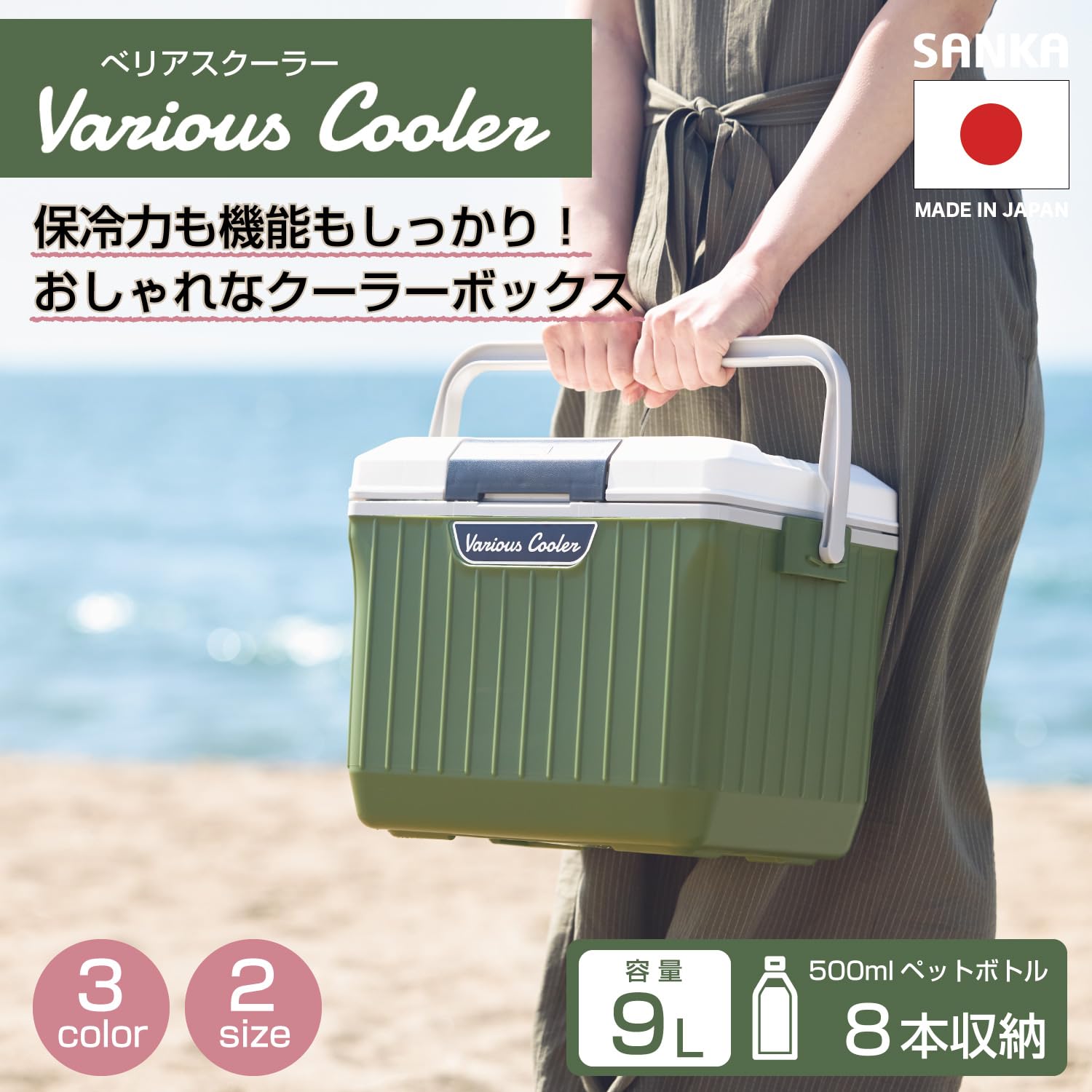 SANKA ベリアスクーラー 9L ホワイト/グリーン 製品サイズ(約):幅375×奥行き270×高さ290mm 製品内寸(約):幅260×奥行き160×高さ230mm 最大容量(約)9L 原産国:日本 ショルダーベルト付き。 収納目安(約)350ml:16本 500mlPET縦置き:8本 高性能断熱材採用で 当社従来品に比べ保冷時間146% 高性能断熱材採用で 当社従来品に比べ保冷時間146%