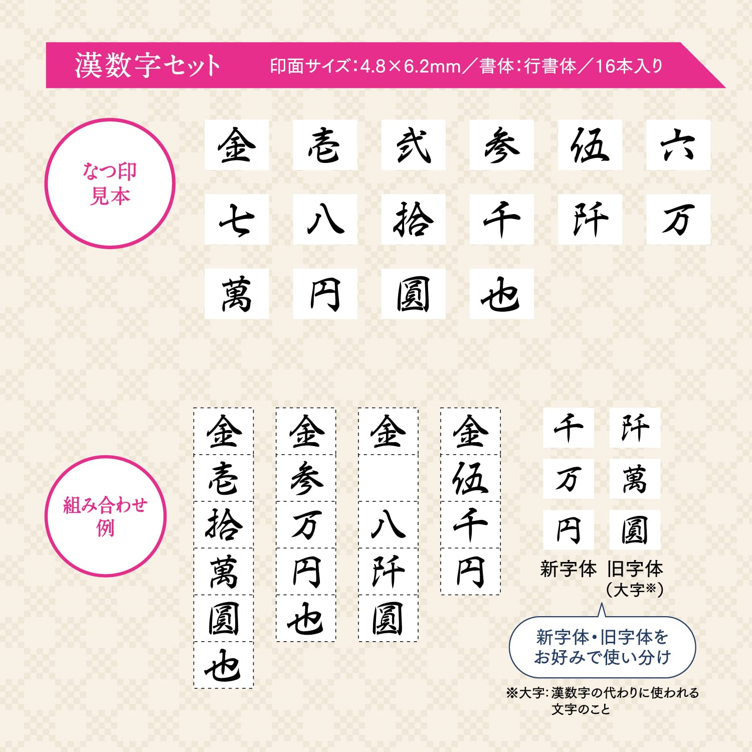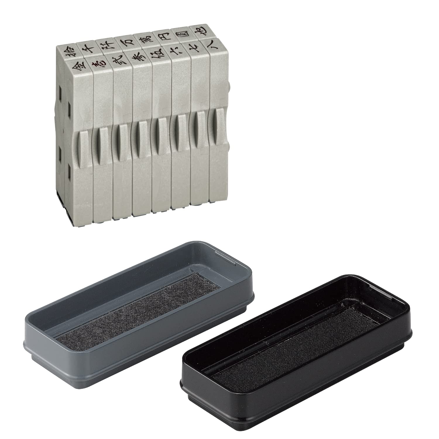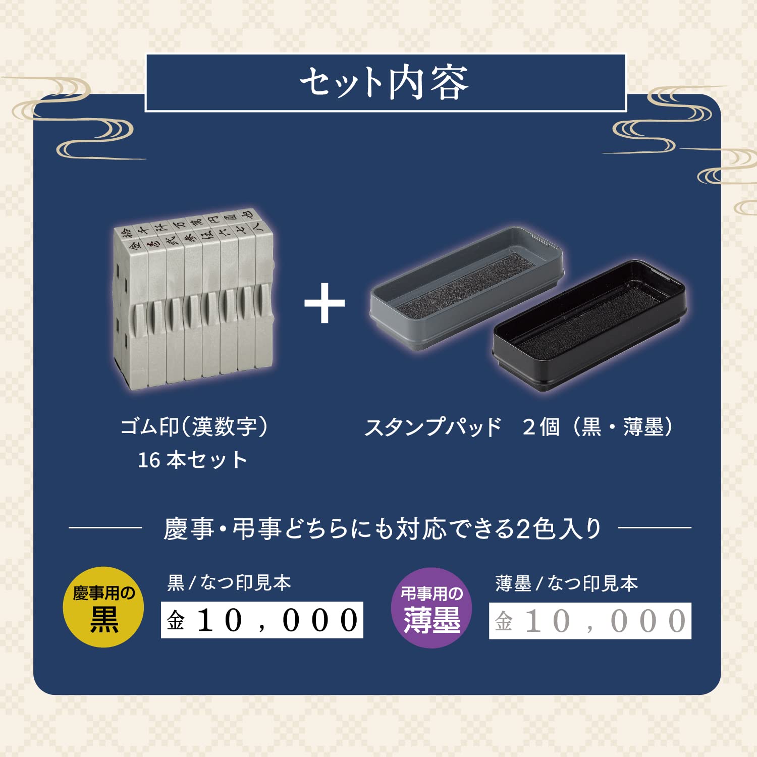 【セット内容】漢数字ゴム印16本、スタンプパッド2色(黒、薄墨)