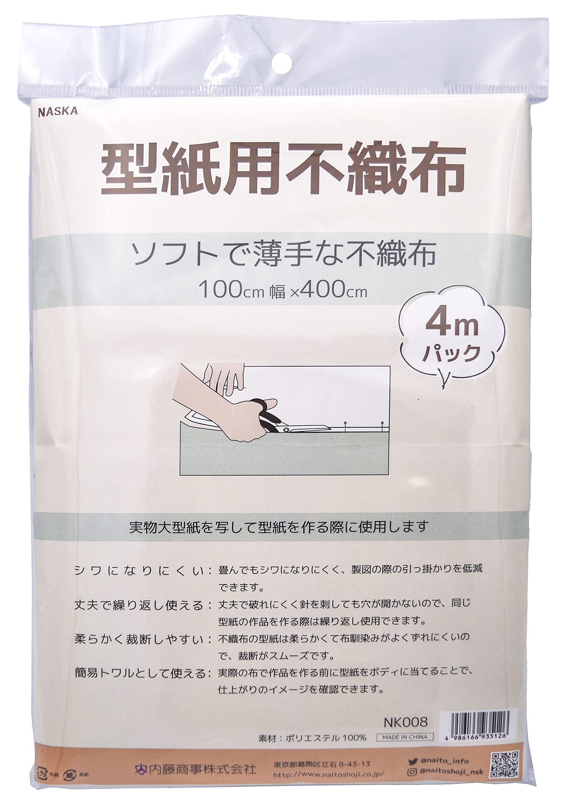 NASKA 型紙用不織布 4mパック 100cm幅×400cm 白 NK008 ソフトで薄手な不織布タイプ 100cm幅×400cm シワになりにくく、丈夫で繰り返し使えて、柔らかく裁断しやすいです。 簡易トワルとしても使えます。 ポリエステル100% ソフトで薄手な型紙用不織布です。100cm幅×400cm入り、ポリエステル100%でシワになりにくく、丈夫で破れにくく繰り返し使え、柔らかく裁断しやすいです。また、簡易トワルとしてもお使いいただけます。
