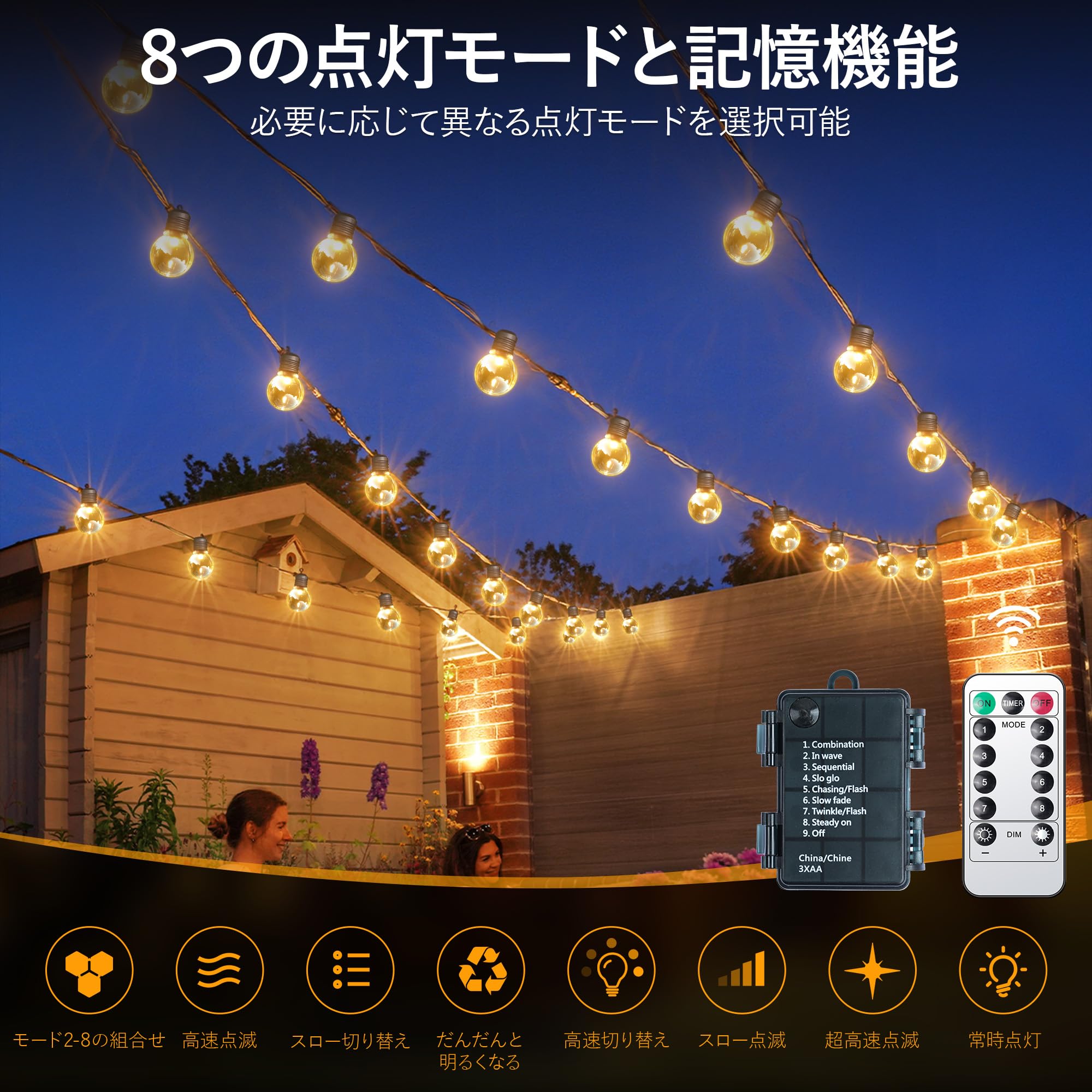 LEDストリングライト 防雨型 9M ガーデンライト 電池式 20個電球 G30 電球色 PC素材 破損しにくい 8種点灯モード リモコン付き 調光可能 タイマー機能 屋内屋外照明 イルミネーション フェアリーライト キャンプ 誕生日 結婚式 クリスマス ハロウィン電飾【適格請求書発行可】
