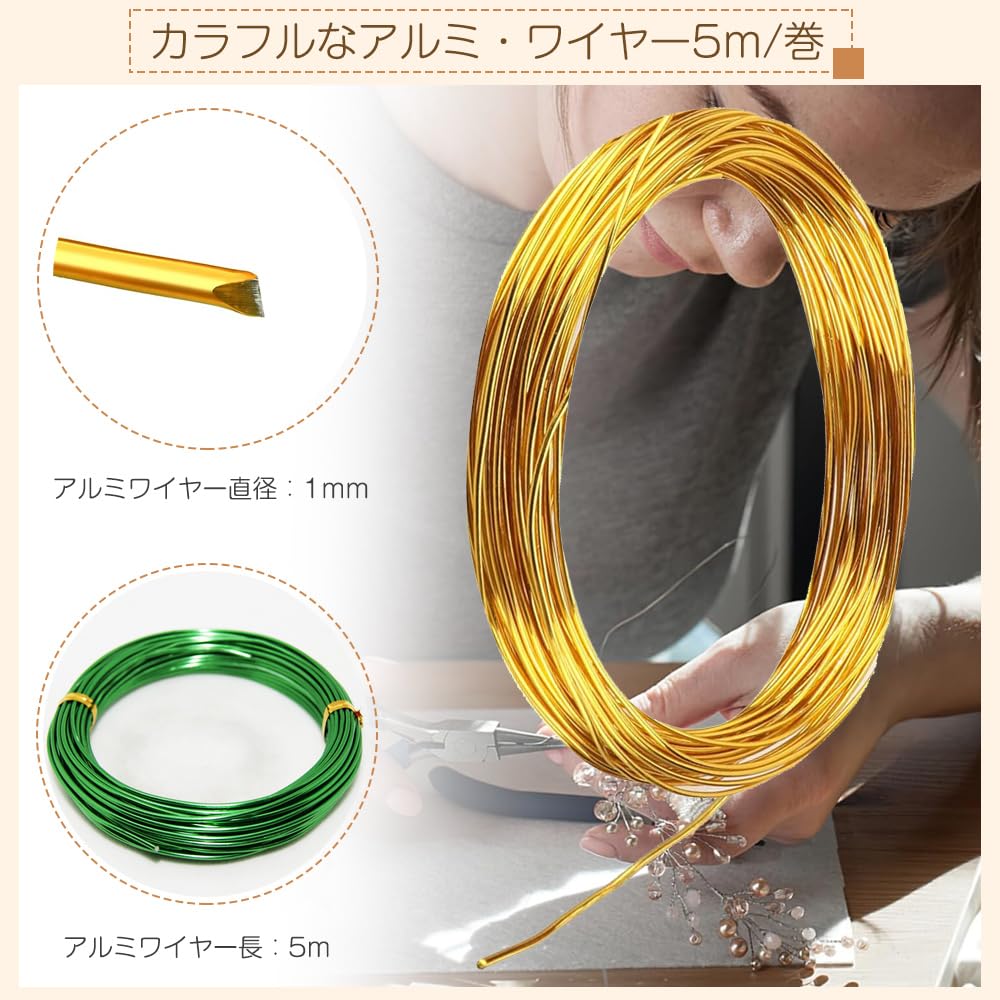セット内容:アルミワイヤー8巻きセット;サイズ:アルミワイヤー長:約5m;直径:1mm (シルバー/ライトブラウン/ブラック/ピンク/ダッジ・ブルー/ゴールド/グリーン/レッド)注意:画面モニターの違いにより、色が異なる場合があります。