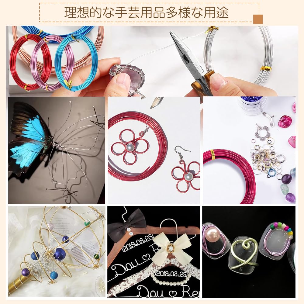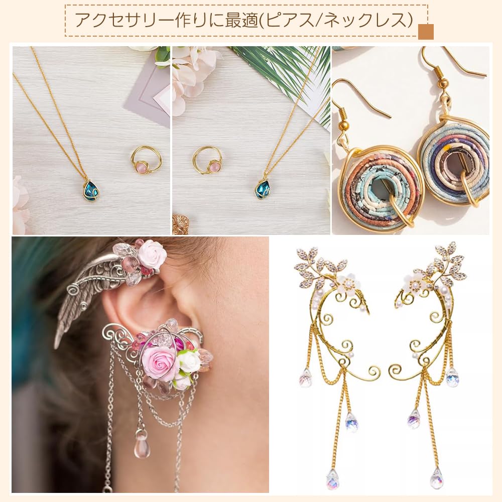 ジュエリー作り:このセットは、ジュエリー作りのアクセサリーとして理想的です。このソフト・ジュエリー・ワイヤーをクリスタルやビーズに巻きつけてペンダントを作ったり、曲げたりねじったりしてさまざまな形を作ることができます。ワイヤージュエリー、ネックレス、イヤリング、ブレスレット、キーリング、ウェディングピンなど、美しいジュエリーやアクセサリーを作るのにお使いください。
