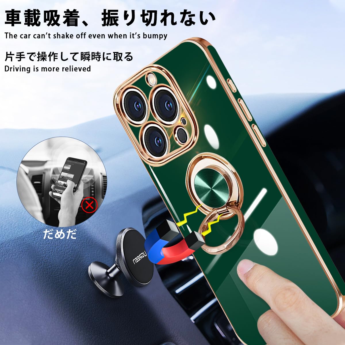 【車載スタンド対応&ストラップ穴付き】内部には金属が内蔵され、マグネット式車載スタンドに対応。*特別ヒント:リング部分は金属ですので、ワイヤレス充電できません。ケースの側面にはストラップホールを搭載しているので、お好きなストラップを付けられ、落下防止にも効果的です。iPhone 16 ProMax ケース