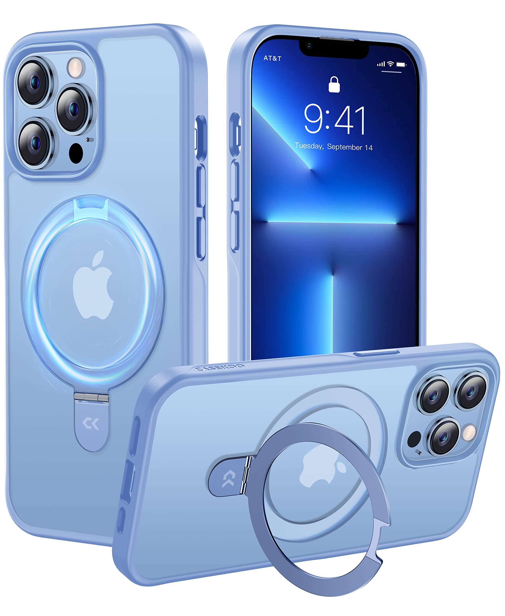 【8年間の技術結晶!4in1超万能モデル】CASEKOO iPhone13ProMax 用 ケース 隠しスタンド 横縦両立 米軍MIL規格 耐衝撃 MagSafe対応 スマホケース 薄形半透明 マット仕上げ 指紋防止 ストラップホール付き ワイヤレス充電対応 アイフォン 13pro max 用 ケース 6.7インチ カバー(シェーラブルー)