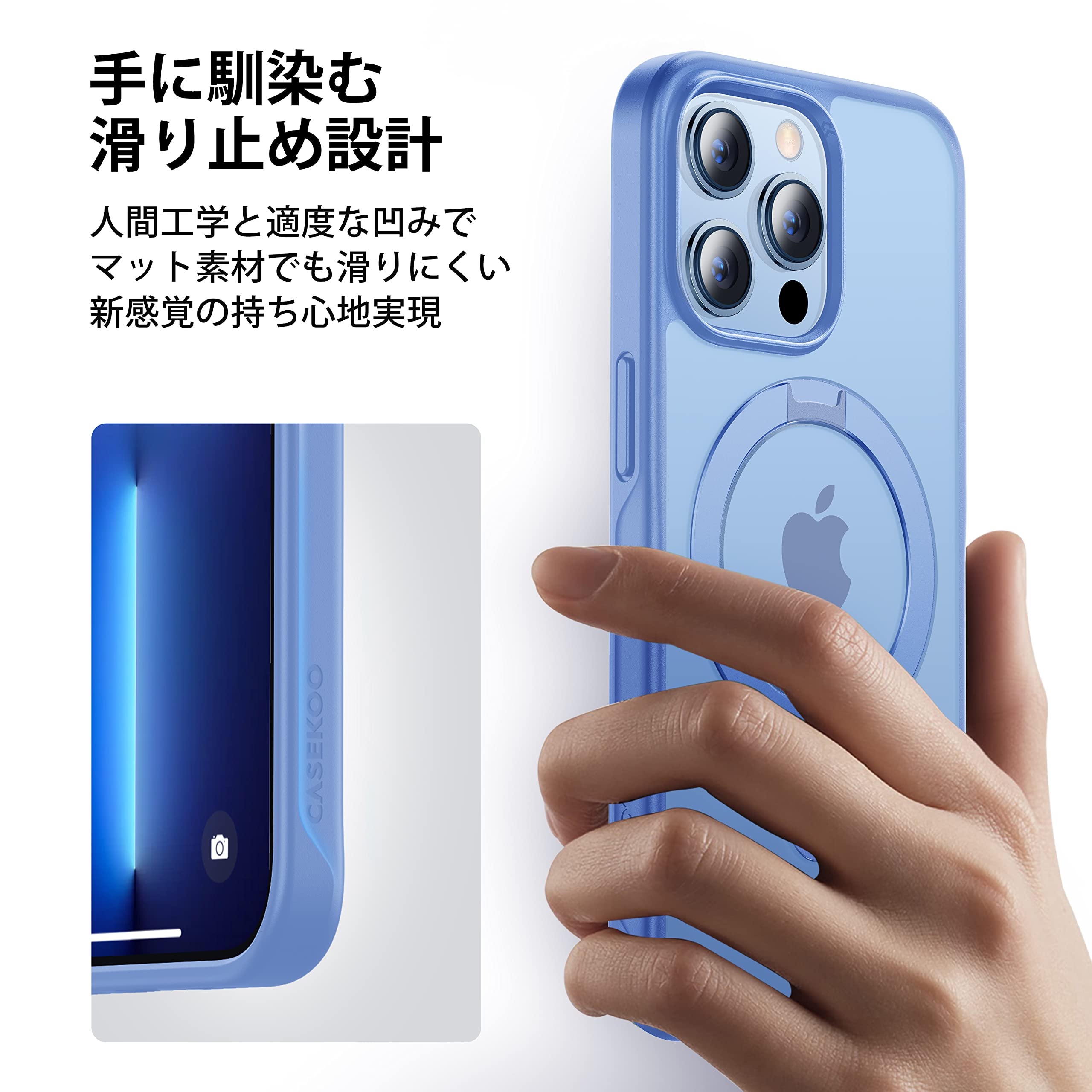 【努力特価】【8年間の技術結晶!4in1超万能モデル】CASEKOO iPhone13ProMax 用 ケース 隠しスタンド 横縦両立 米軍MIL規格 耐衝撃 MagSafe対応 スマホケース 薄形半透明 マット仕上げ 指紋防止 ストラップホール付き ワイヤレス充電対応 アイフォン 13pro max 用 ケース 6.7インチ カバー(シェーラブルー)