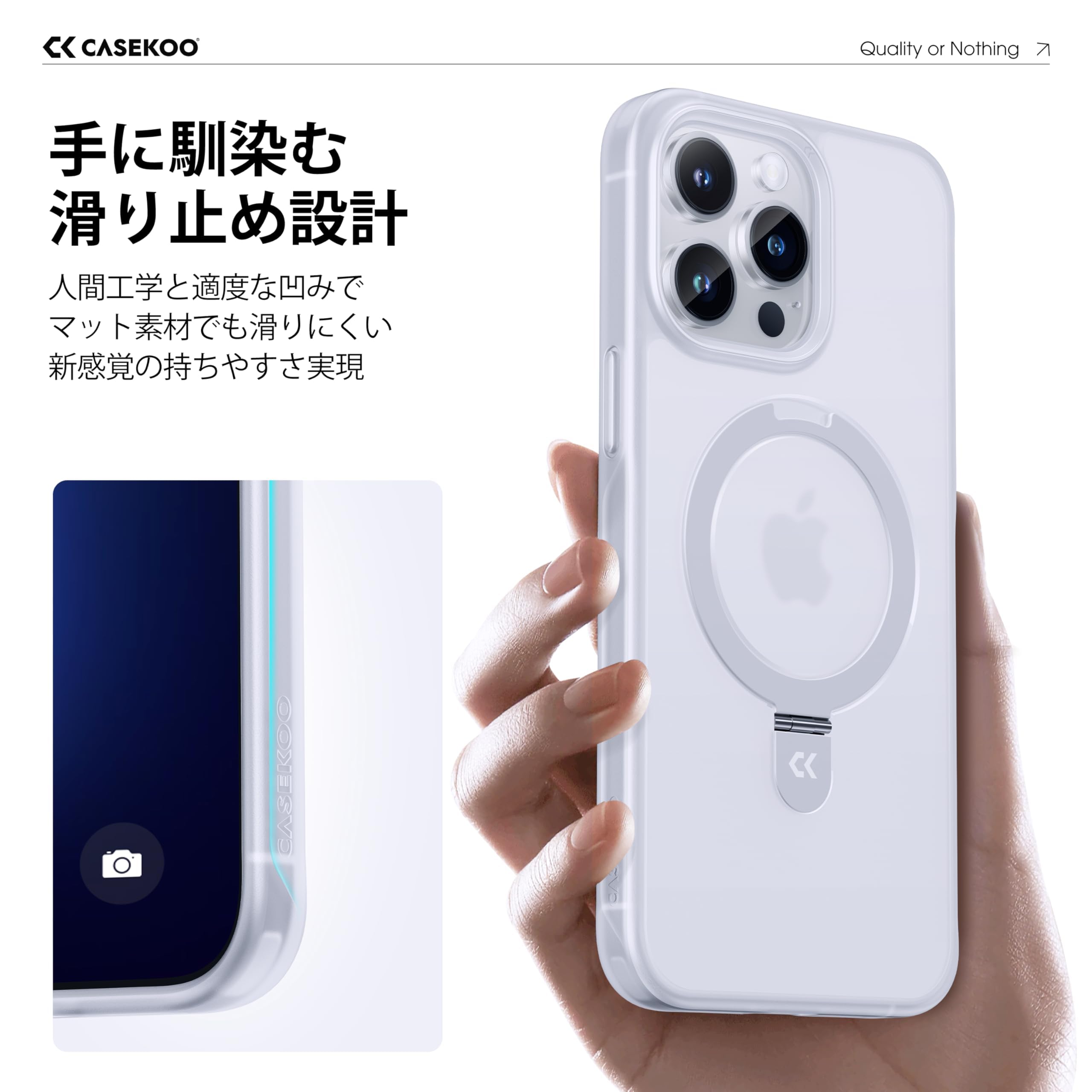 ??【実用性を追求・多機能設計】市場調査によると、多数の方がこんな悩みを抱えています:①立てに使いたい時すぐスタンドが見つからない②Magsafe充電のたびに外したりして手間かかる③スマホを長時間持つ疲れてしまう。そこで、CASEKOOは2013年から10年間にわたって、ついに「MagicStand」シリーズが誕生しました!一体成型の設計で置けばスタンドになり、手にすればリングになる、さらにMagsafe機能搭載でそのまま充電できる、これ一つあれば複数のアクセサリーを持ち歩く必要なく、より便利で快適な暮らしを実現!※【2023年度iFデザイン国際賞受賞しました!】