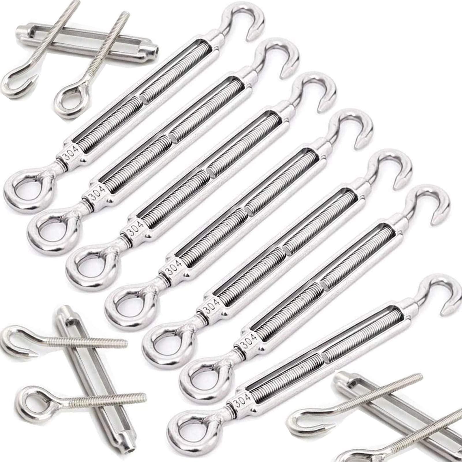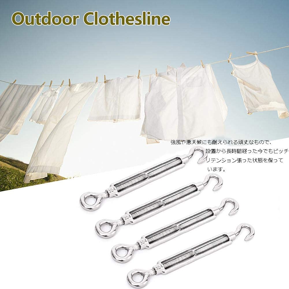 高強度・耐環境性:ターンバックルは高品質の304ステンレス鋼で作られており、防水性、防錆性、耐腐食性、高い引張強度と抗疲労強度を備えています。フックとアイのターンバックルは、したロープを締め、弾性効果を調節するのに役立ちます。