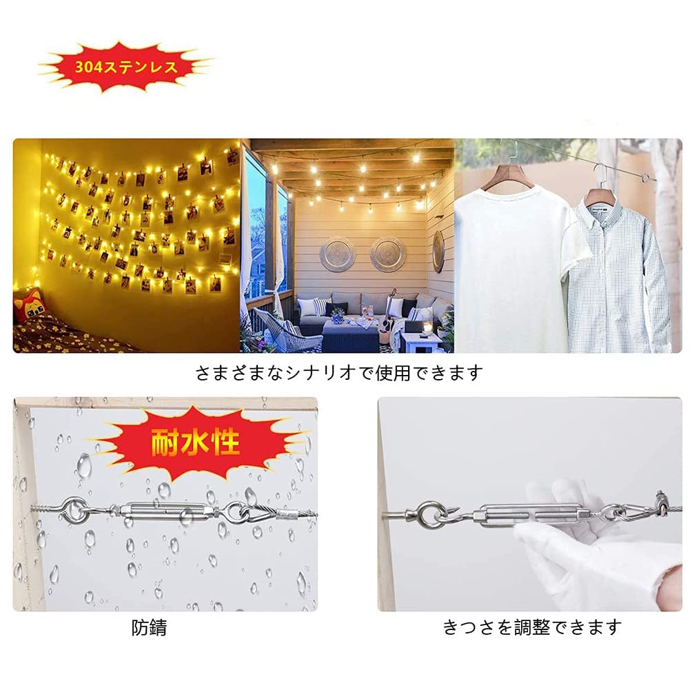 幅広い用途:強風対策などカーポートの固定、倒れそうな恐れのある樹木などの固定、物置やその他の構造物の固定など、物干しロープの引き上げ、装飾照明用のワイヤーを掛けますフェンスのリンク、トラックキャンピングカーの固定など。風が強い海岸沿いの地域は特に錆に強いステンレス製をお勧めします。