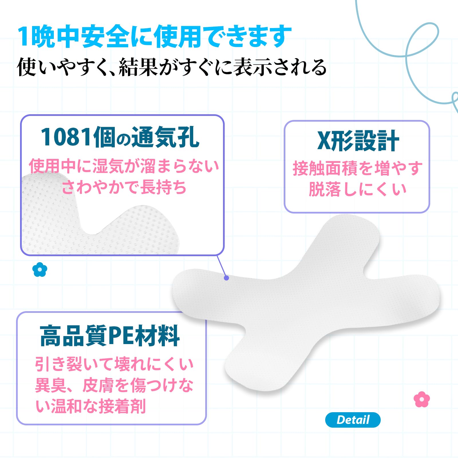?【X型 脱落しにくい】 鼻呼吸テープのユニークなX字型デザインにより、粘着力が分散され、自然に口が開くのを防ぎます。 他の形状だと口呼吸防止テープが落ちやすいという方におすすめです。