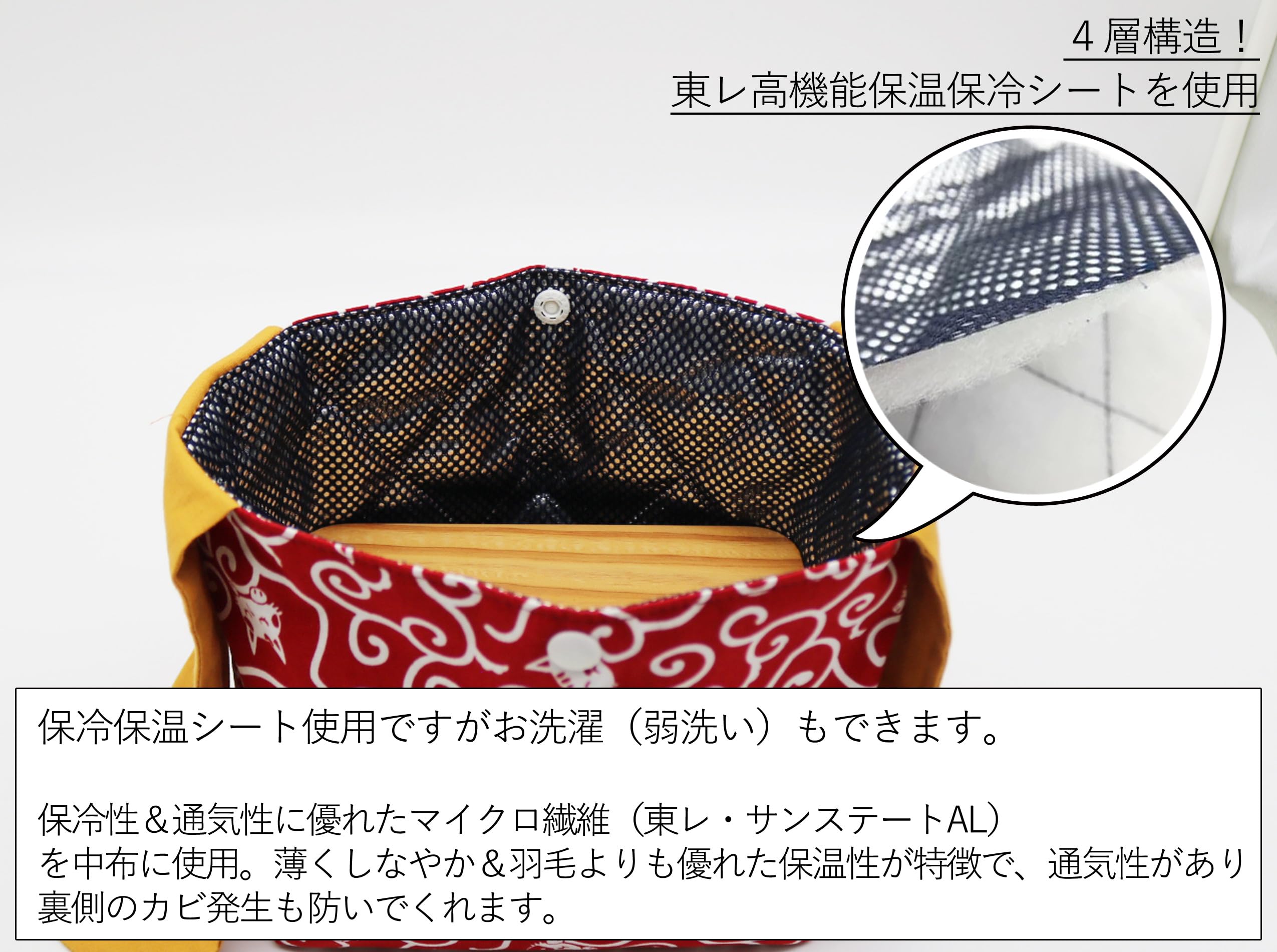 保冷・保温のお弁当袋で、お洗濯が可能です。一般的な保冷保温シートとは違い、裏にカビが生えたりはがれてくることがなく布のような柔らかさがあります。折り目の角が破れることもありません。
