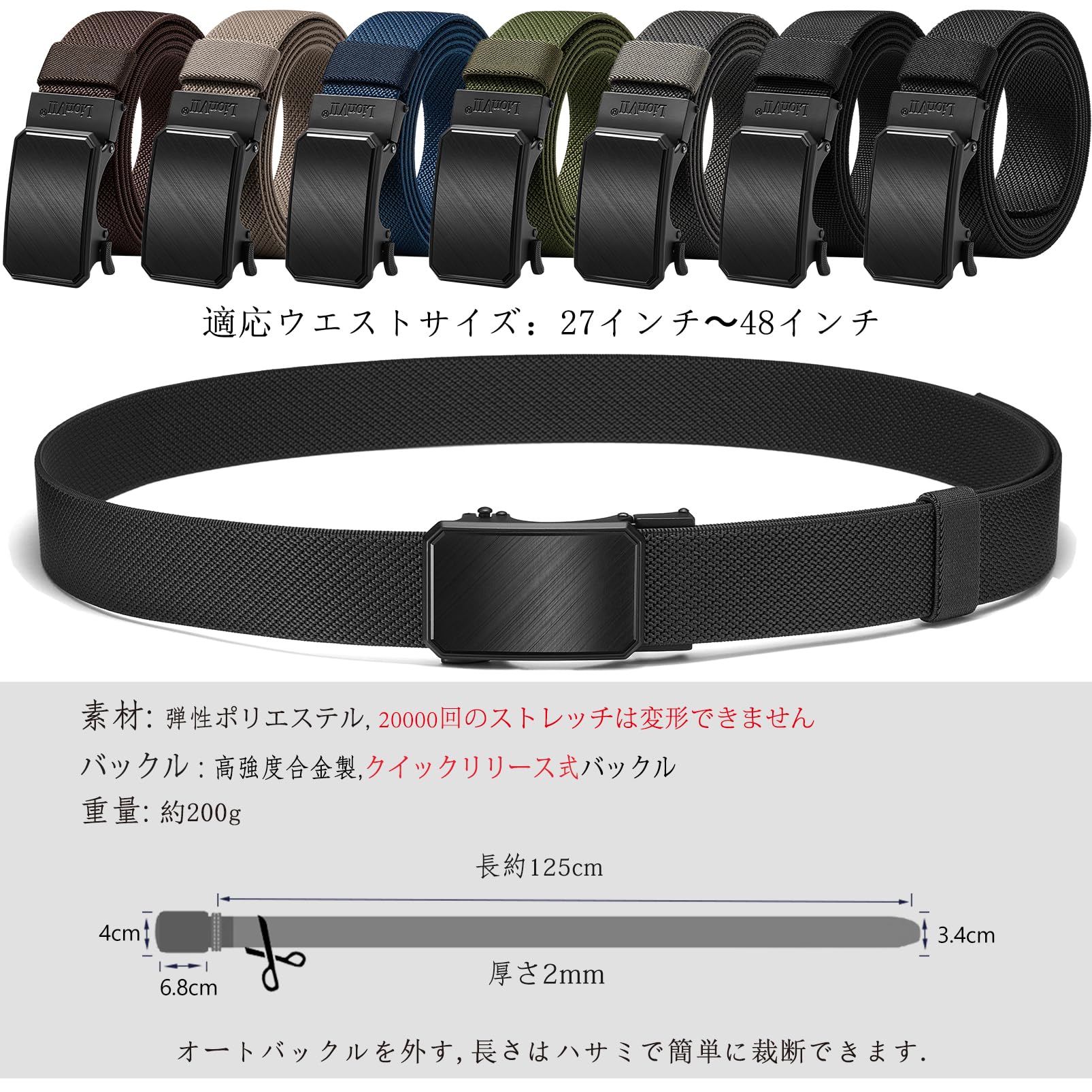 【在庫処分】[LionVII] 伸縮 ベルト メンズ - オートロック式 ベルト 作業 スポーツ 登山 ゴルフ - ナイロン ベルト 作業着 伸びる 穴なし 無段階調節 合金バックル 幅34mm長125cm【ウエスト75cm-115cmに最適】