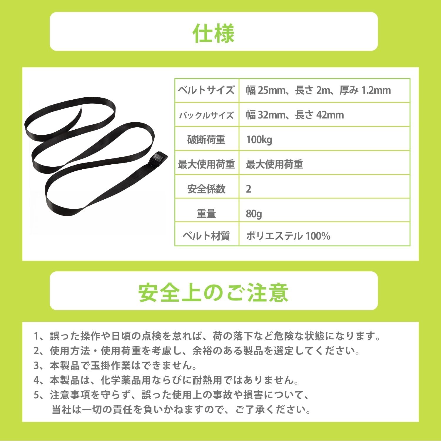 ?【商品仕様は】・2mベルト2個セット・ ベルト サイズ:幅25mm、長さ2m、厚み1.2mm ・ バックル サイズ:幅32mm、長さ:42mm ・破断荷重:100kg、最大使用荷重:50kg、安全係数:2 ・重量:80g ・ベルト 材質:ナイロン100%
