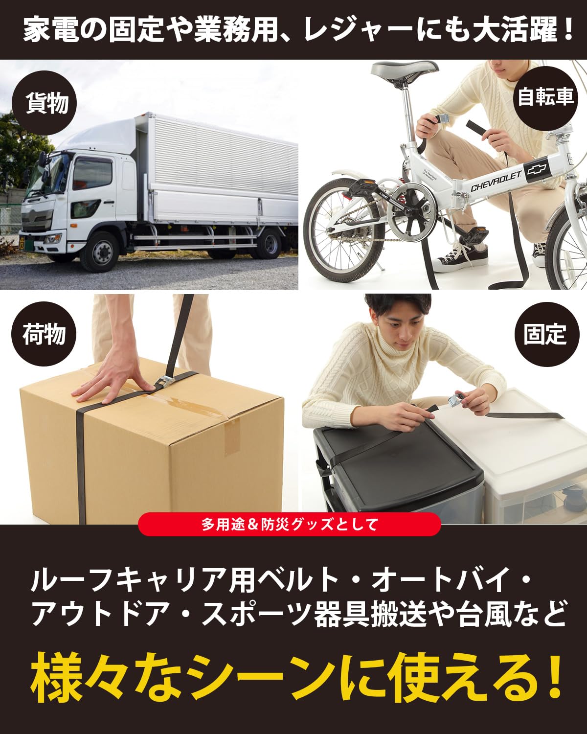?【多用途&防災グッズ】多用途 の ベルト として車の ルーフキャリア 用ベルト・オートバイ・キャンプ・アウトドア・スポーツ器具などの個人向け搬送の道具のみならず、近年発生の多い地震やゲリラ豪雨台風の 対策グッズ として会社や一般家庭では バイク・シャッター・物置・商品棚などの固定にもお勧めです。