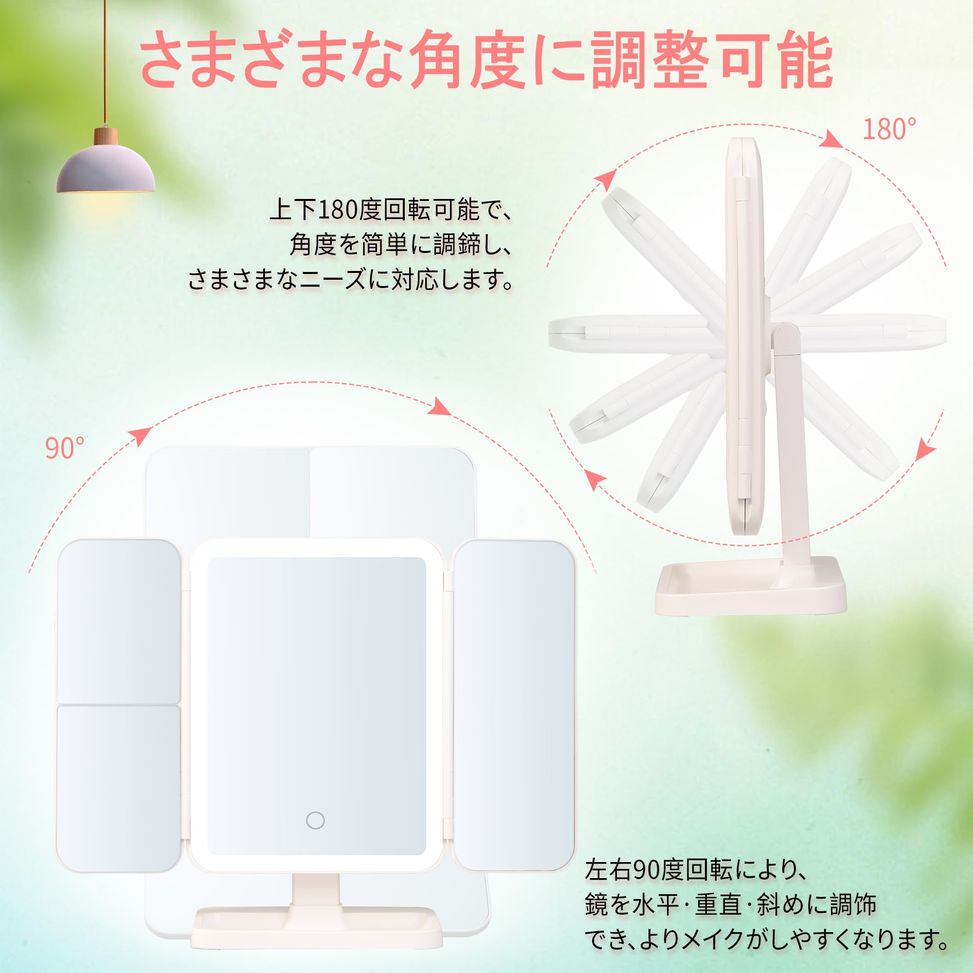 【角度回転調整】90度左右、180度上下に回転できる設計で、様々な角度で使用可能。鏡の底にはイヤリングやヘアピン、リップスティックなどの小物を収納できるトレイがあります。