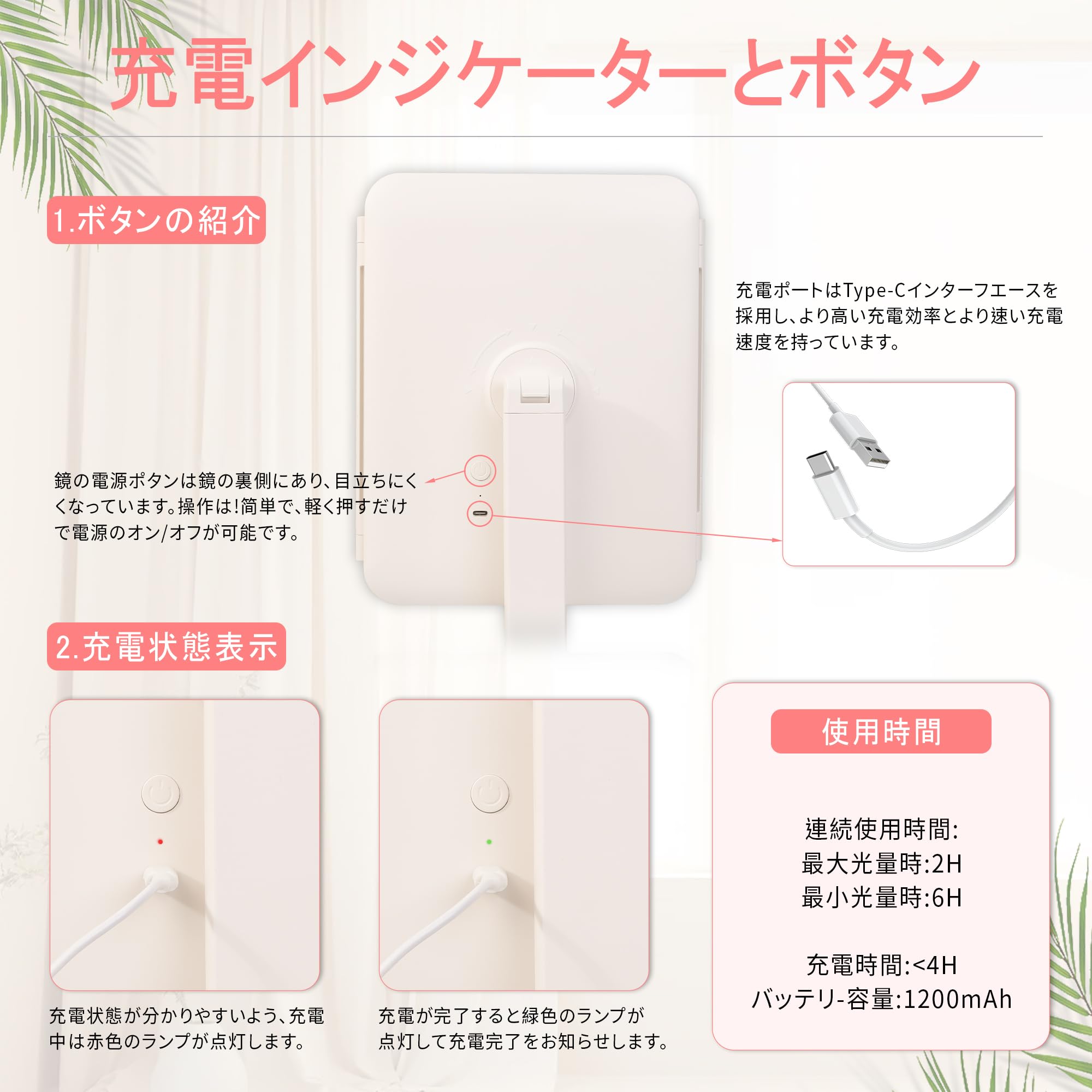 【明るさ調節】化粧鏡は70個の高輝度LEDライトを備えています。ボタンを短く押すと、3つのライトモードが切り替わり、ライトがオンまたはオフになります。用途に応じて3種類のライトカラーを切り替え可能。天気や部屋の照明に関係なく、メイクを楽しめます。ボタンを長押すと、暗い⇔明るい調光が可能。背面のボタンは主電源スイッチです。LED ライト機能を使用するには、このボタンをオンにする必要があります。
