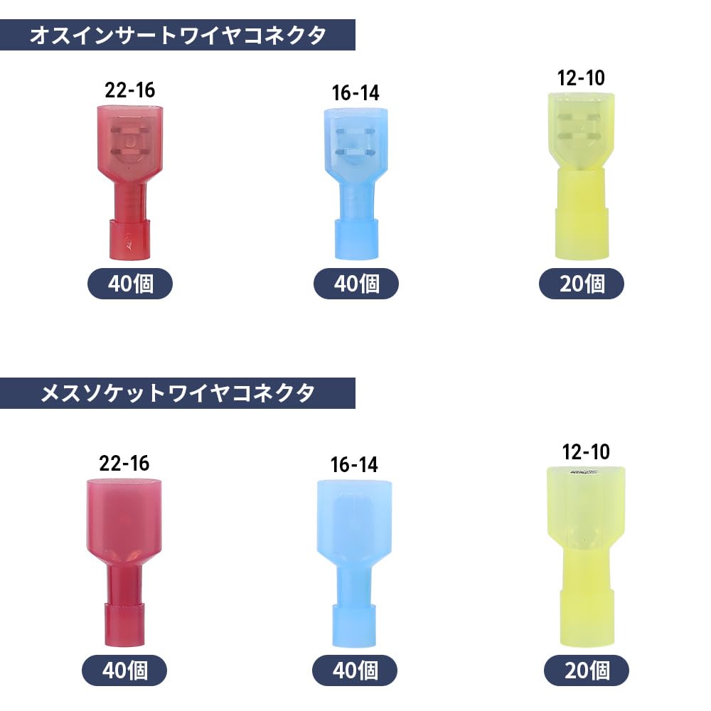 【200個セット内容】オスインサートワイヤコネクタ: 22-16(レッド)* 40個、16-14(ブルー)*40個、12-10(イェロー)*20個。メスソケットワイヤコネクタ: 22-16(レッド)* 40個、16-14(ブルー)*40個、12-10(イェロー)*20個。