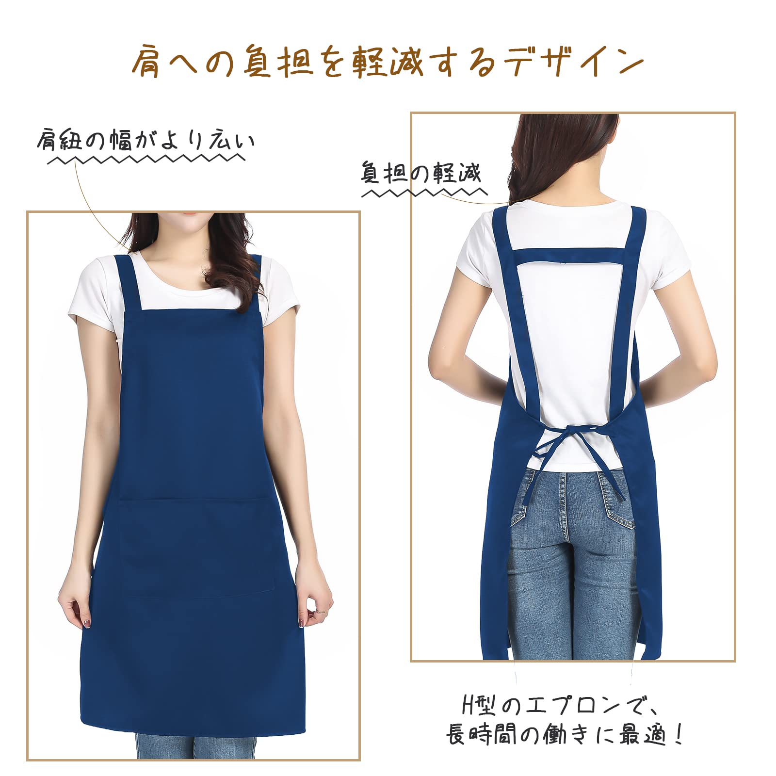【シンプルなH型】肩紐は太い設計で肩に優しい、さらにナイロン製のエプロンに比べて、 丈夫で、縮みにくいし、しわもなりにくいです。腰紐もしっかりしているので、お仕事で繰り返し使っても心配いらない。