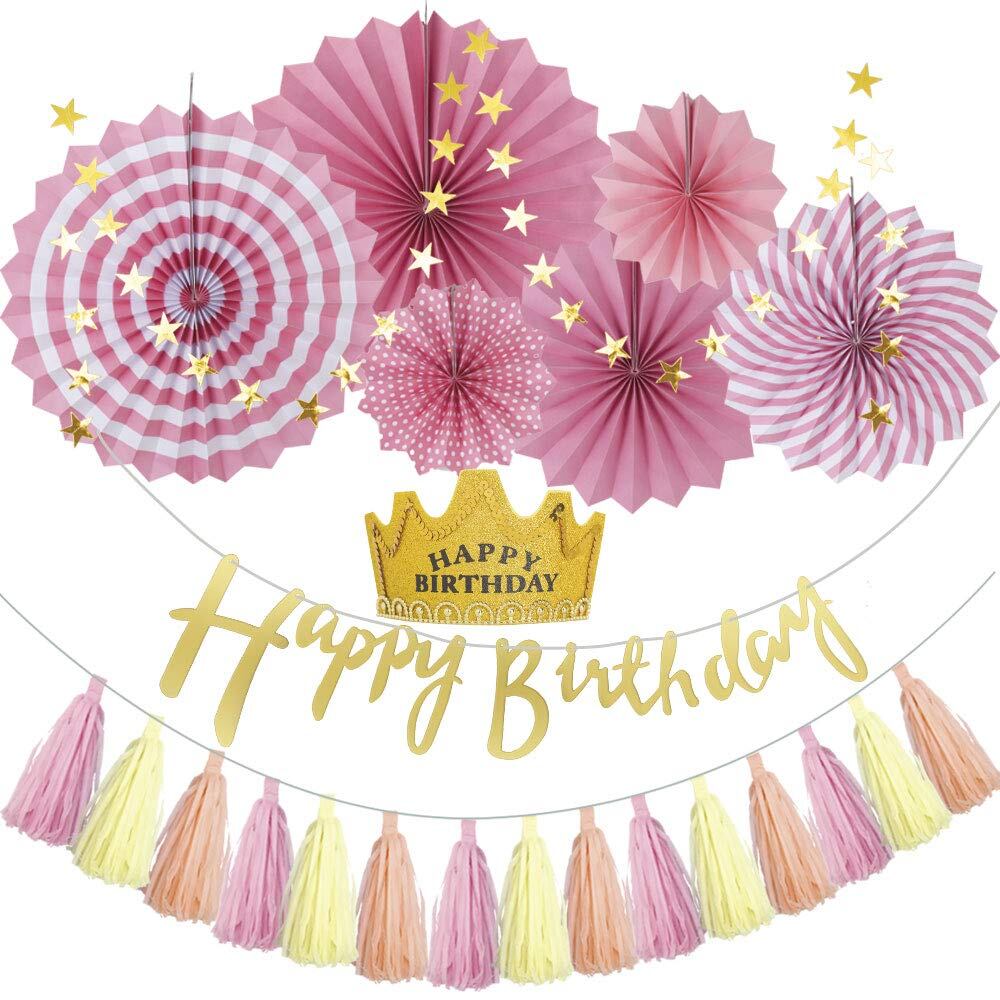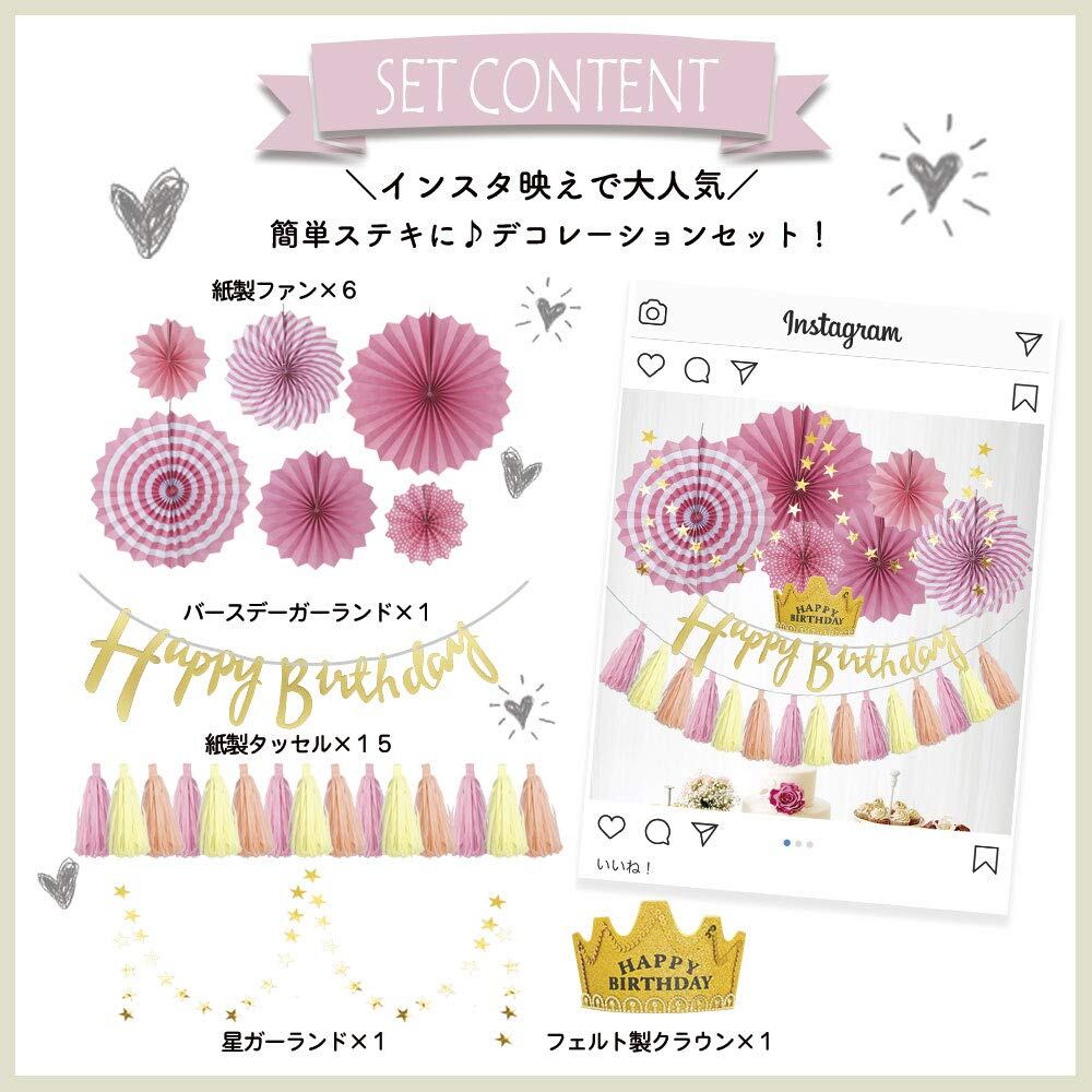 【Hapipa】バースデー 誕生日 飾り付け ガーランド happy birthday 人気 デコレーションセット 女の子 大人 王冠 カチューシャ (ピンク ペーパーファン)