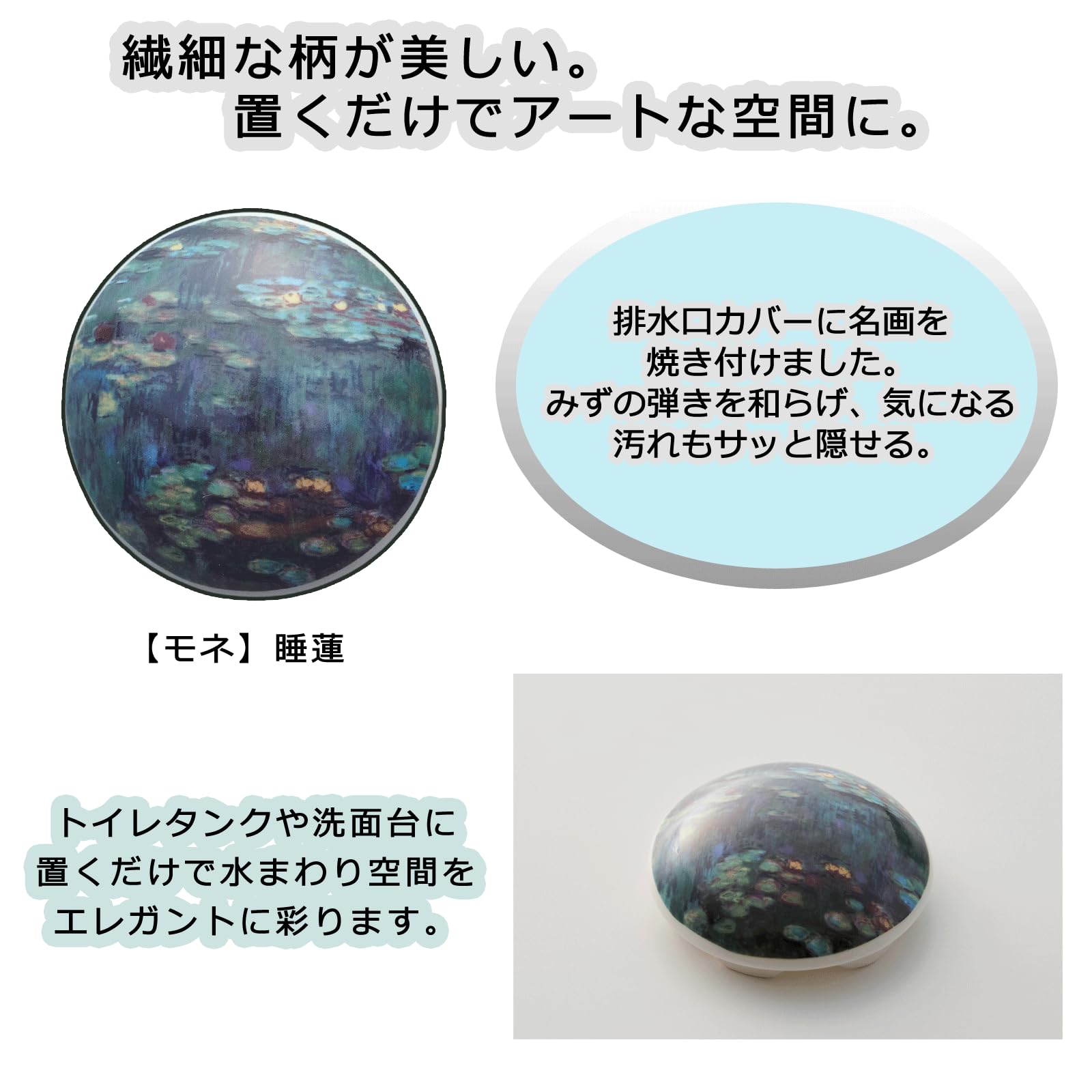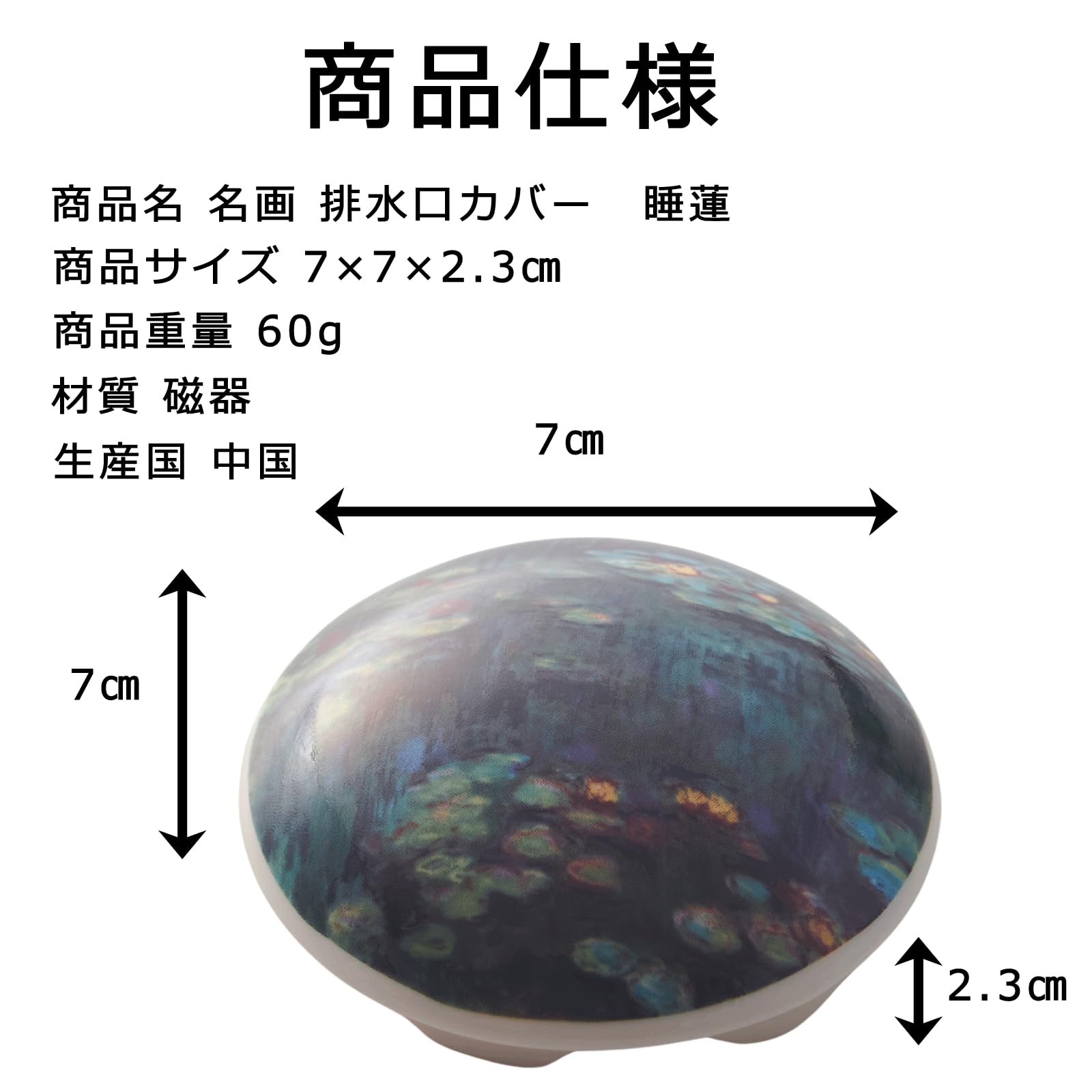 サンアート 名画 排水口カバー 睡蓮 洗面台 トイレ タンク カバー 水まわり かわいい インテリア おしゃれ アート エレガント 磁器 セラミック 蓋 流し台 お手洗い 81021200 【サイズ】7×7×2.3cm 【材質】陶器 【生産国】中国 材質 磁器 ブランド サンアート 色 ホワイト 商品の寸法 7幅 x 2.3高さ cm 商品の重量 60 グラム
