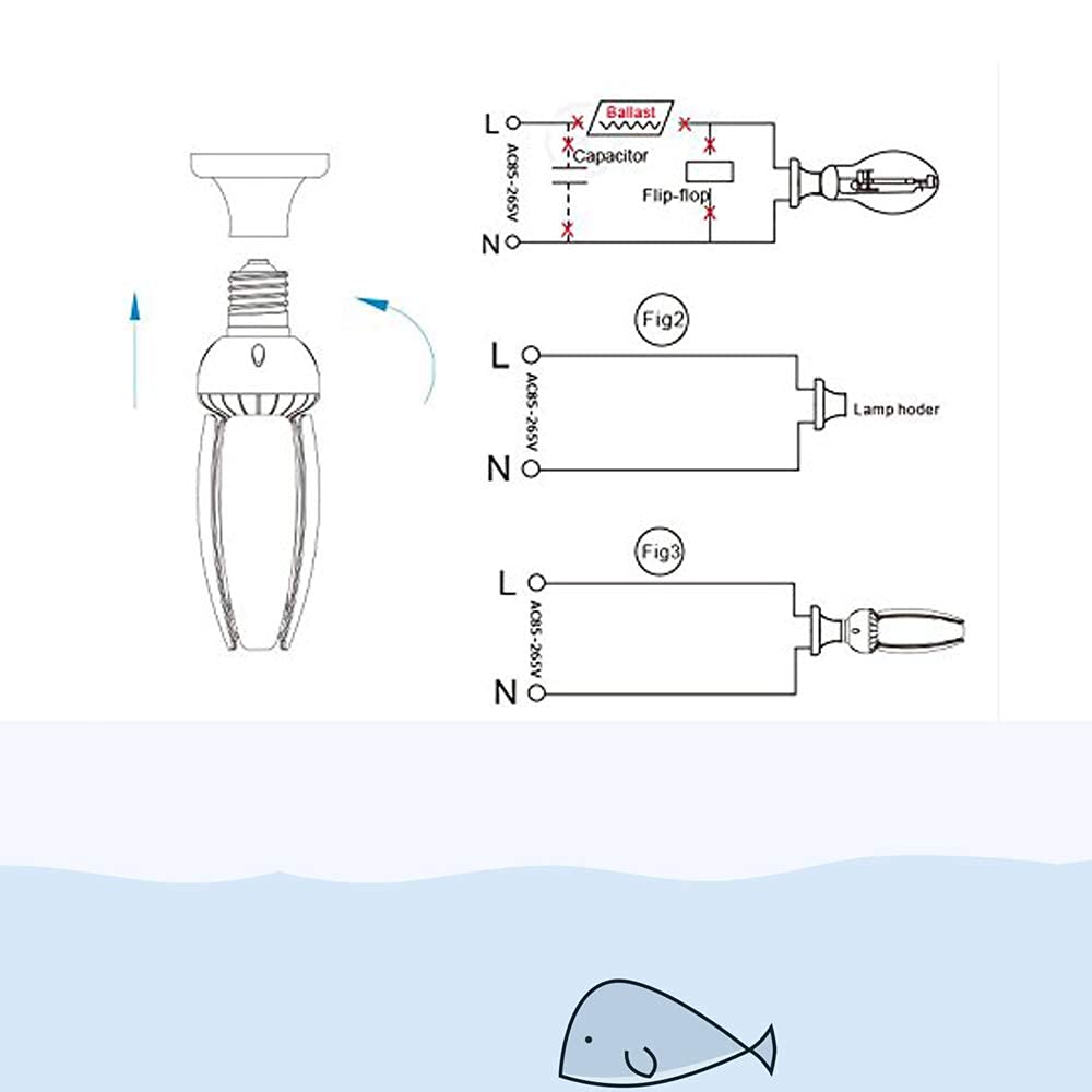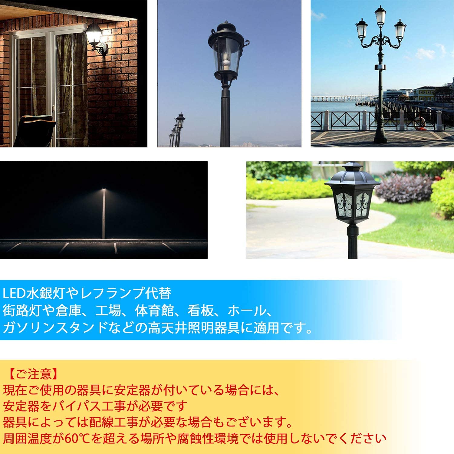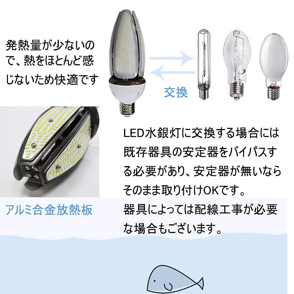 【取り付けご注意】LED水銀灯に交換する場合には、既存器具の安定器をバイパスする必要があり、安定器が無いならそのまま取り付けOKです。器具によっては配線工事が必要な場合もございます。