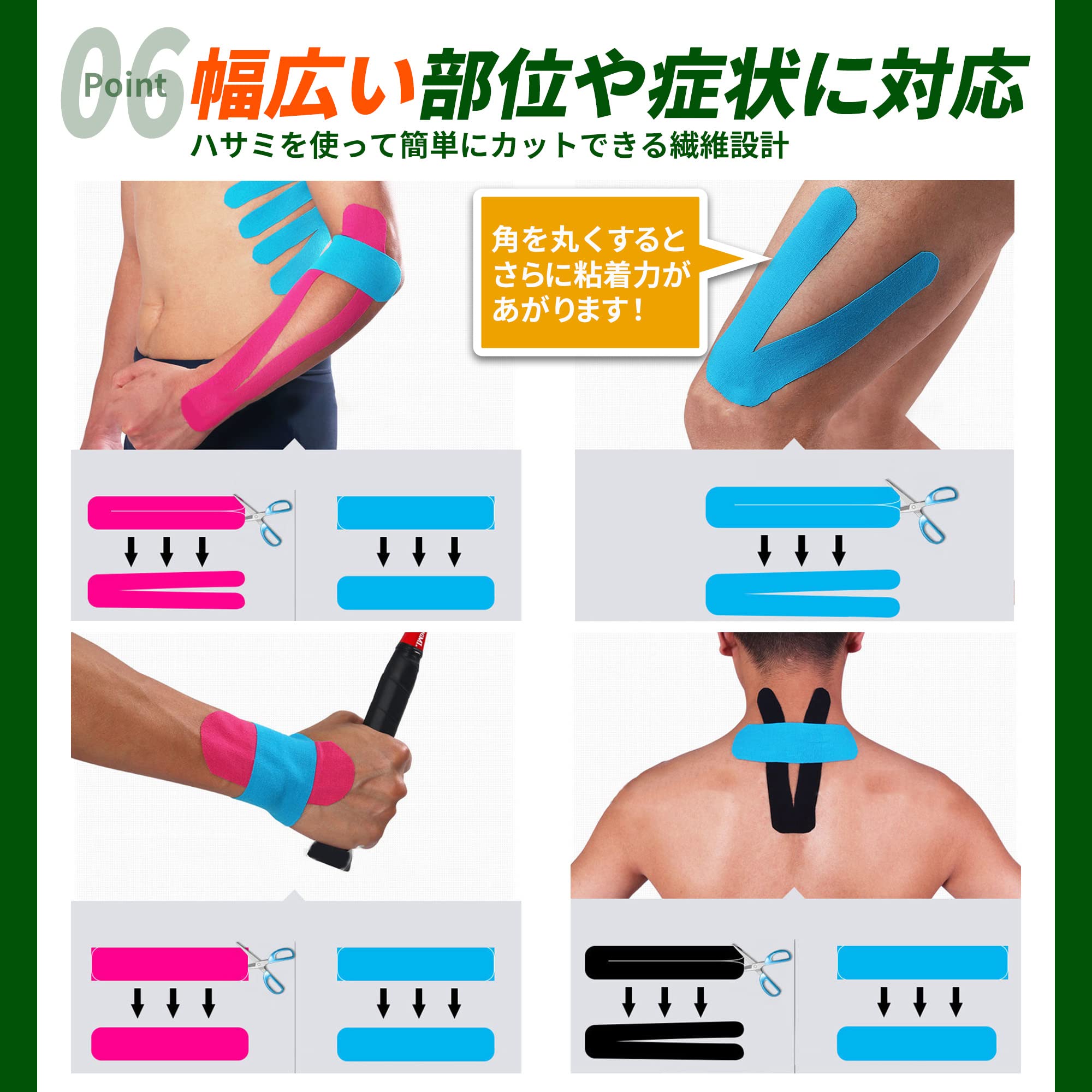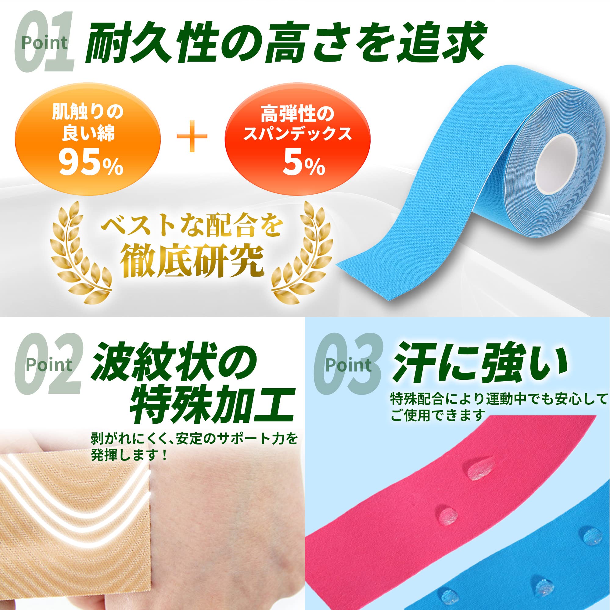 【①汗や水に強い】特殊波紋上の加工によりテープが優しくも確実に肌をとらえて固定できます。【②伸縮性】人間工学に基づきベストな伸縮性を実現、気持ちよくご使用頂けます。