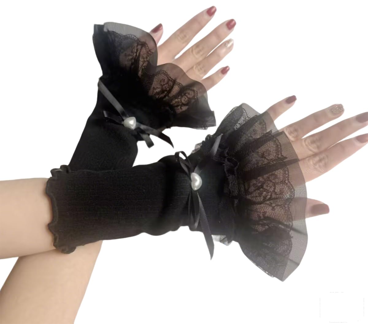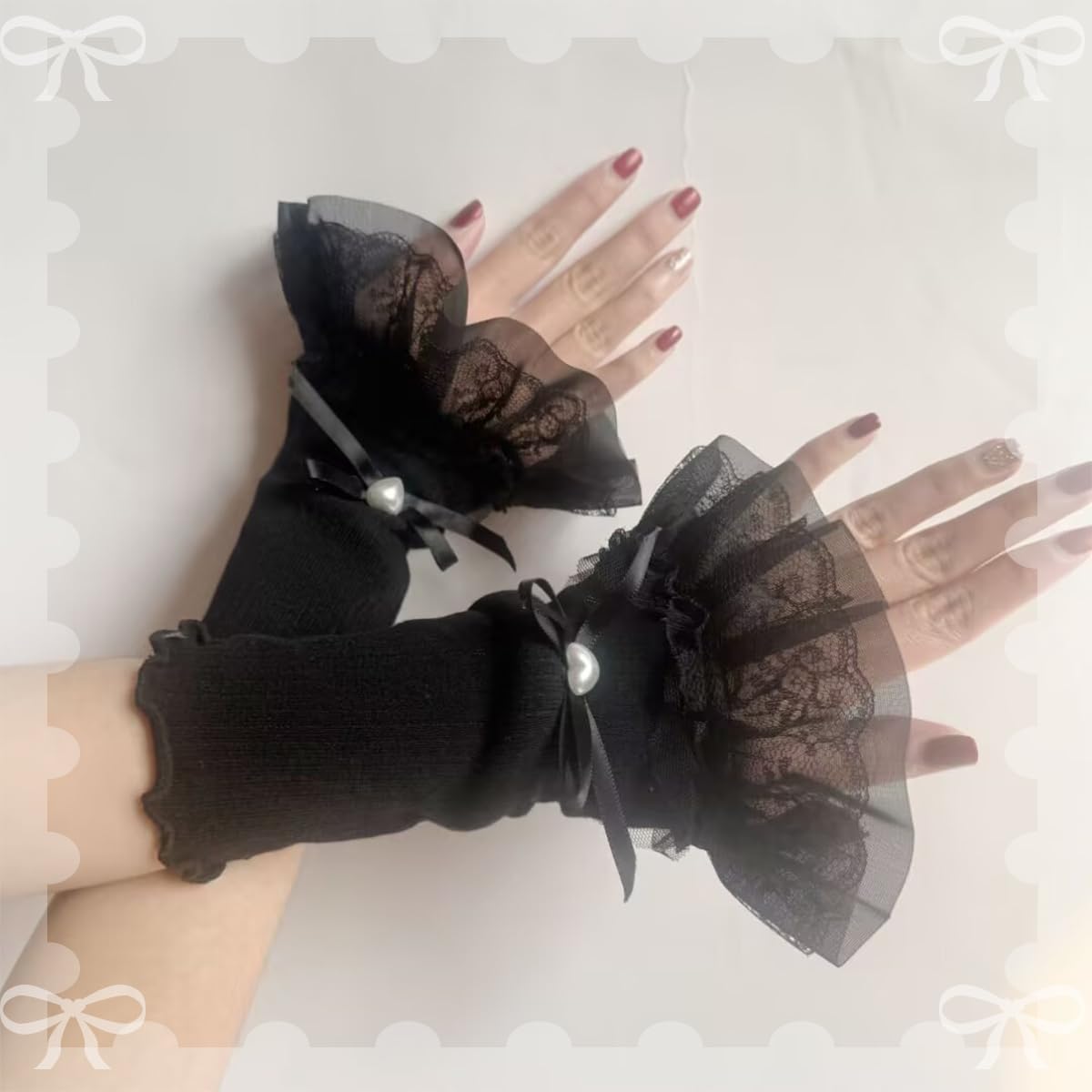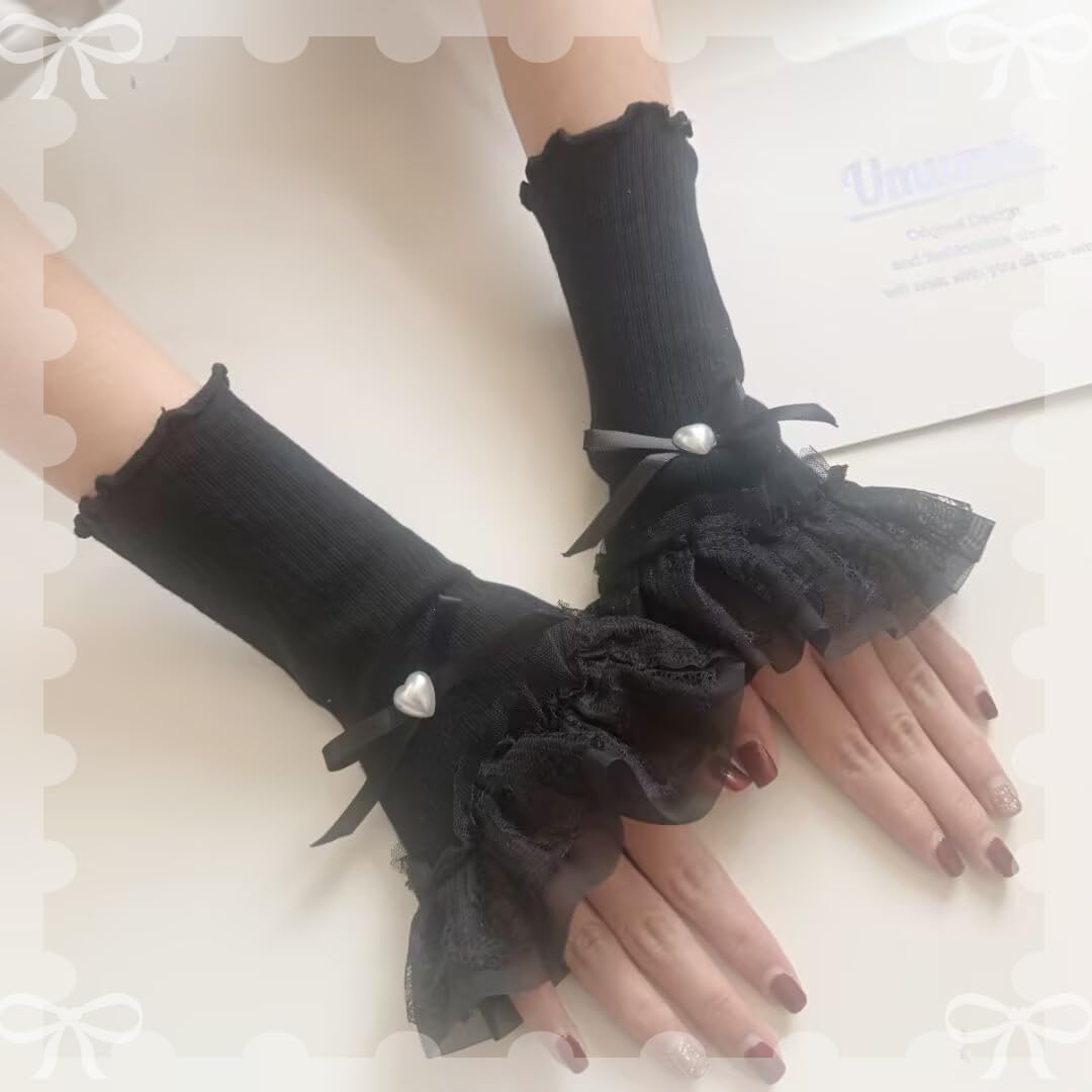[Ekieta] アームウォーマー レディース つけ袖 レースフリル アームスリーブ 薄手 花柄 指掛けタイプ かわいい ロリータ 袖口積み重ね ちょう結び おしゃれ y2k 日焼け止め ガーリー系 お姫様 地雷系