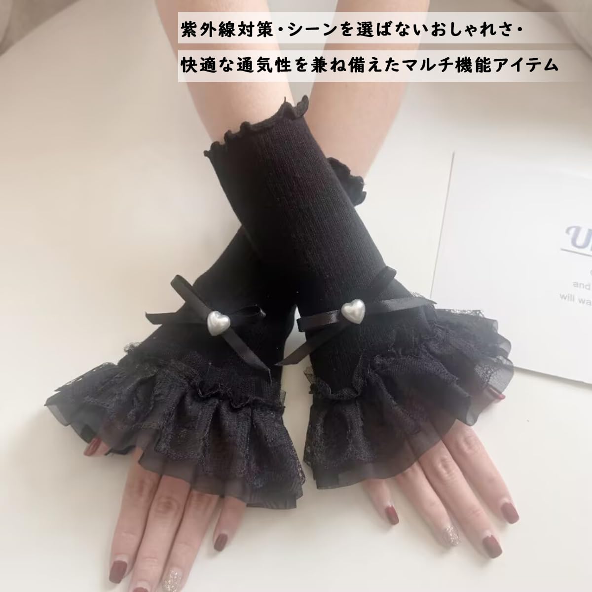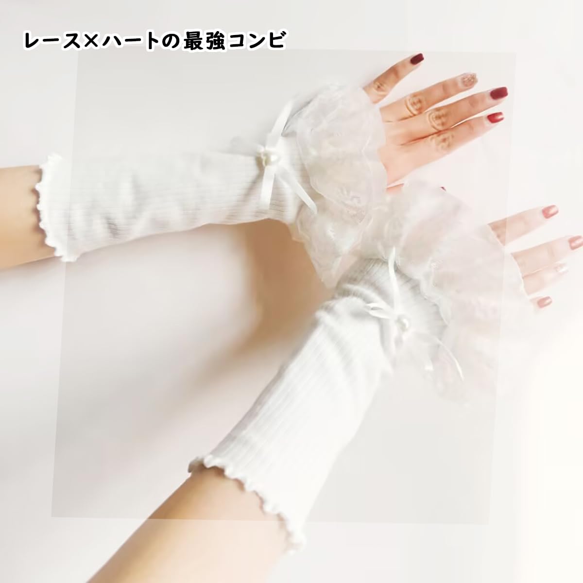 【特徴】レースのアームウォーマーはとてもゴージャスに見えますが、驚くほど軽くて通気性も抜群です。また、親指穴があるので脱げにくく動きやすいです。