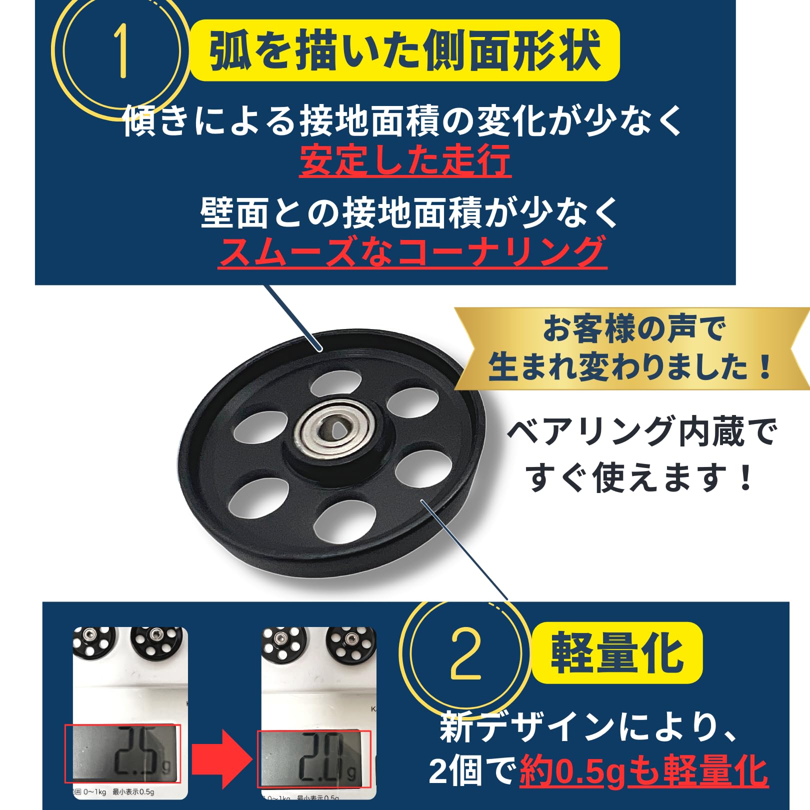 ?19mmの大径タイプでコースのつなぎ目の段差を吸収しやすく、安定して走ることができます。また、プラリングタイプと比べコースに食いつきやすいのでフロントローラーにおすすめです。