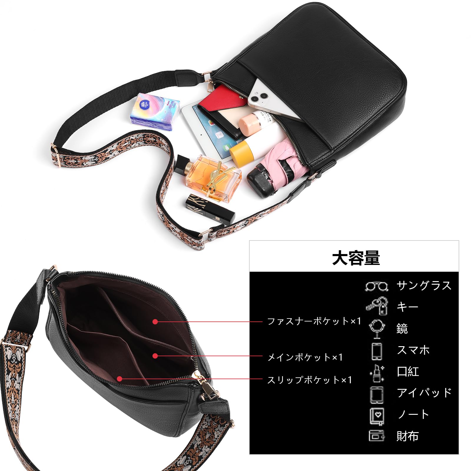 【大容量・多機能】サイズ:長さ28cm×幅8cm×高さ24cm。重さ:370g。このショルダーストラップは幅3.56cm、長さは82cmから130.81cmの間で調節可能です。 バッグは軽量で持ちやすく、サイズもちょうどいいです。 携帯電話、アイパッド、ノート、化粧品、サングラス、財布、ティッシュ、鍵などの必要品を入れるスペースがたっぷりあります。