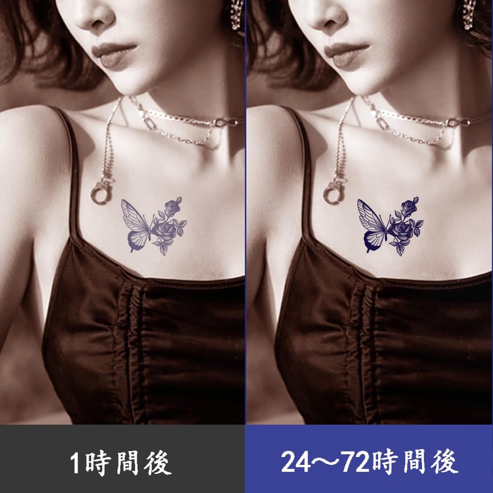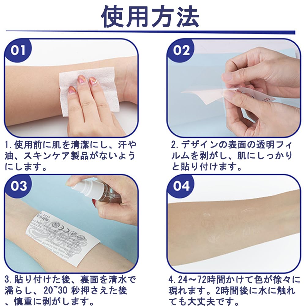 【優質材料】高品質な材料を使用しており、防水性が強く、長時間貼り付けても色あせにくいです。タトゥーの効果は約2週間持続します。
