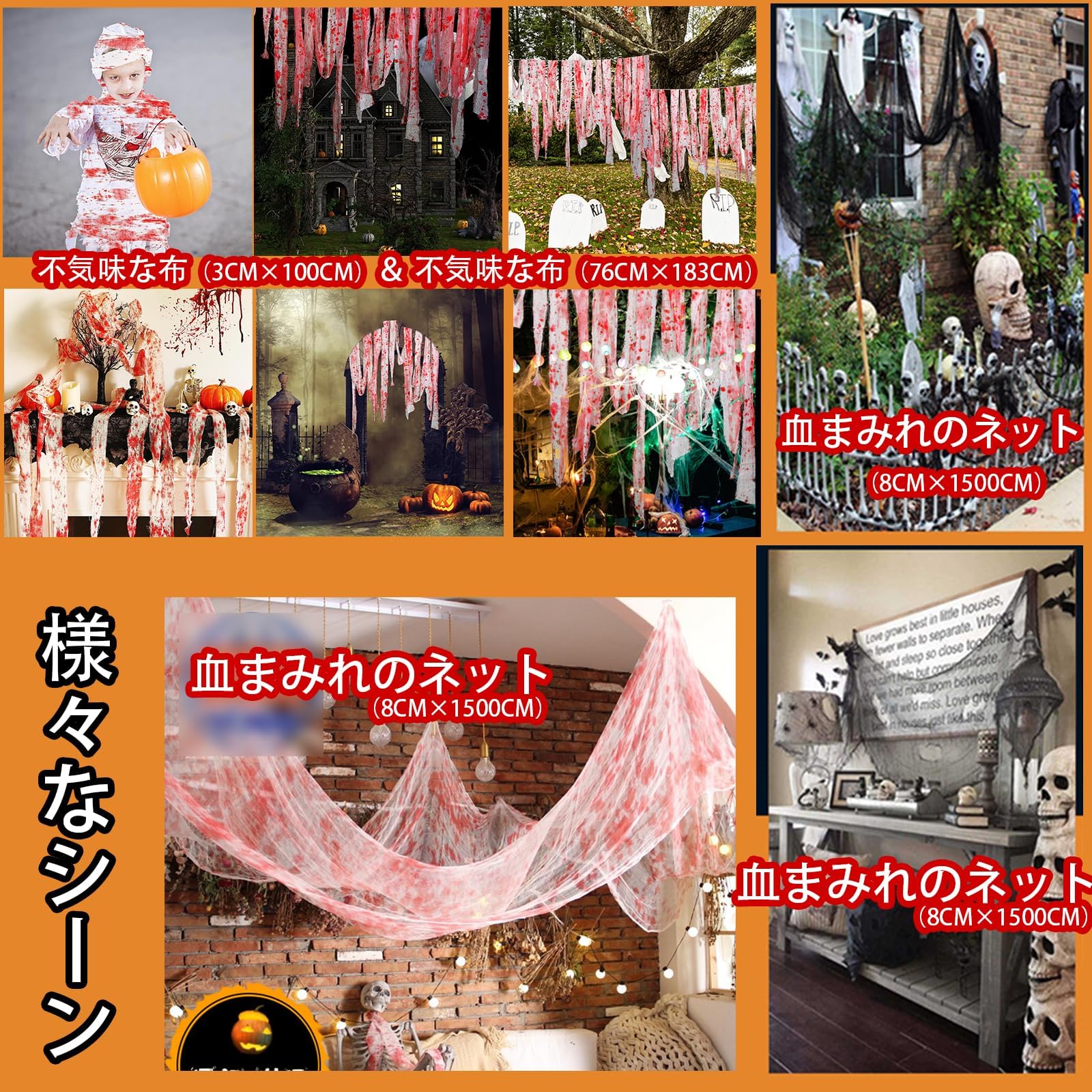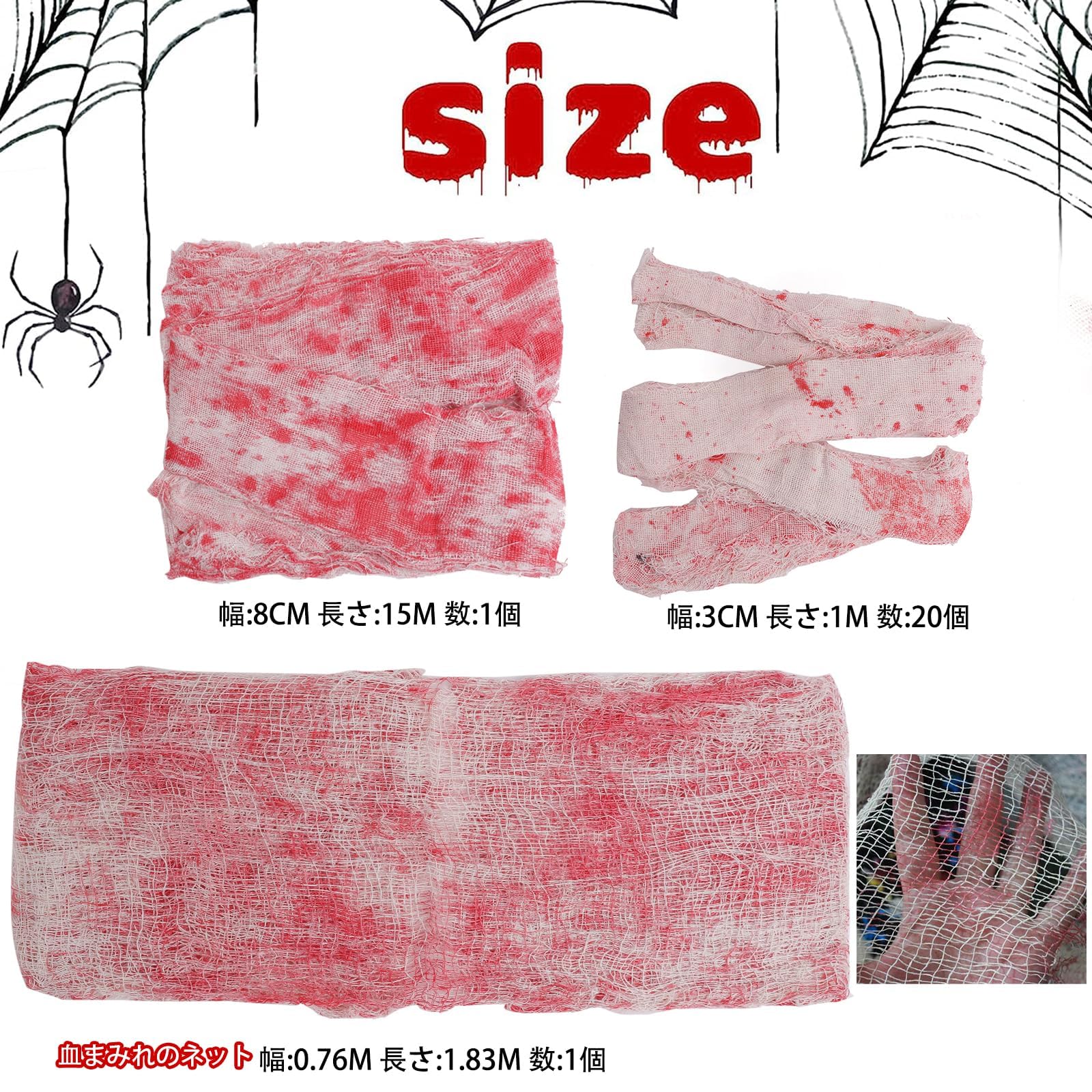 セット内容:不気味な布(8CM×1500CM) 1個;不気味な布(3CM×100CM) 20個;血まみれのネット(76CM×183CM) 1個