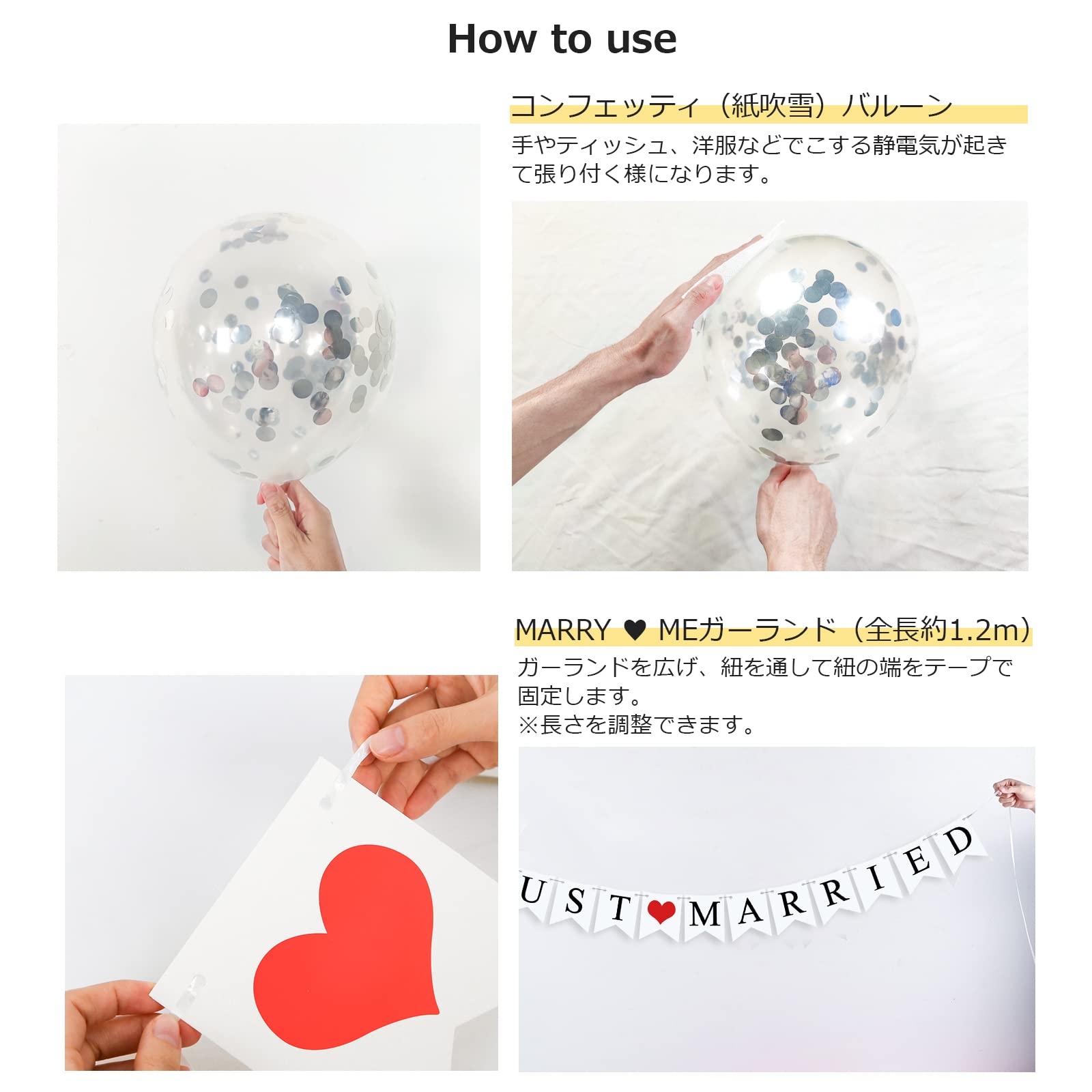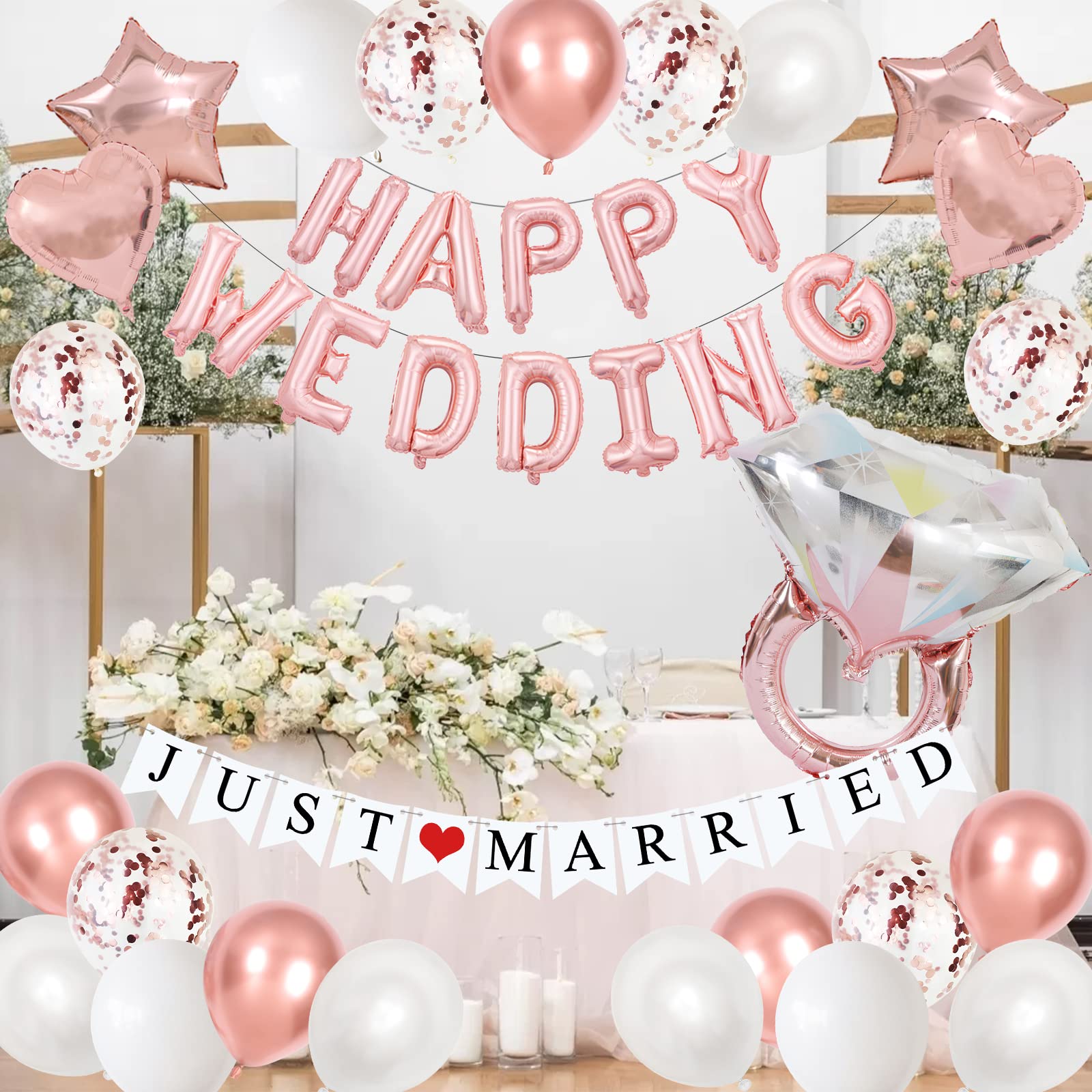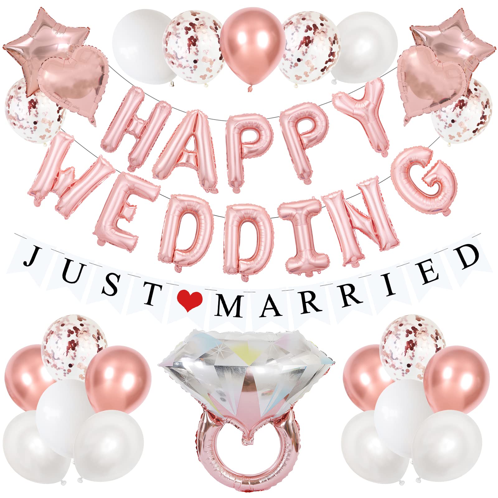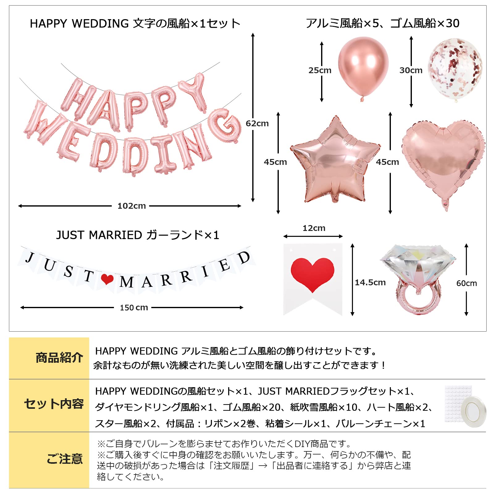 ■セット内容:HAPPY WEDDINGの風船セット×1、JUST MARRIEDフラッグセット×1、ゴム風船×20、紙吹雪風船×10、ハート風船×2、スター風船×2、ダイヤモンドリング風船×1、リボン×2巻、粘着シール×1、バルーンチェーン×1