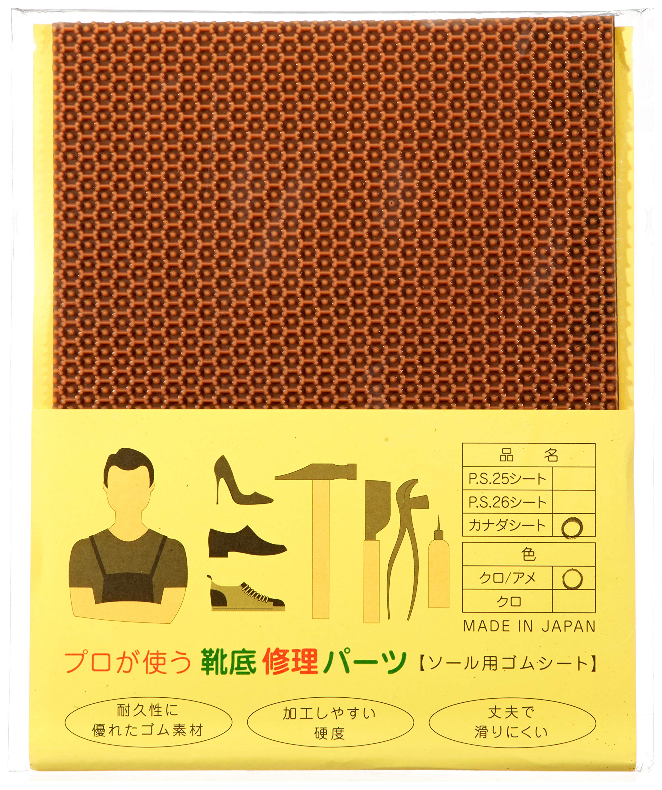 (本製品はゴムシートのみです。実際に作業する場合、金づち、ゴム用ボンド、カッター又はハサミ、サンドペーパー、台金、仕上げ用ケミカルインク又は靴クリーム等が必要になります。)