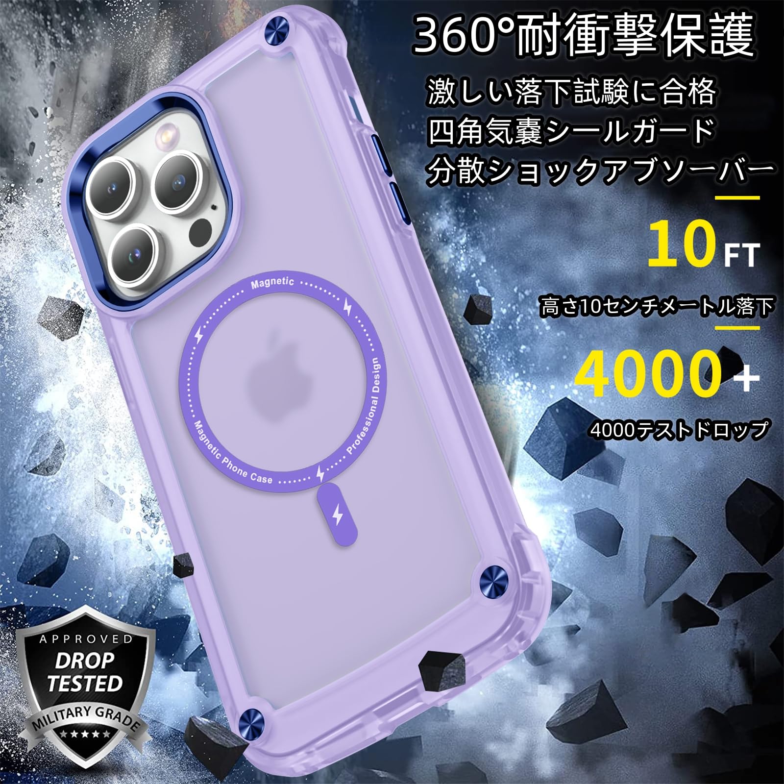 iPhone13 Pro 用ケース 磁気センサーリング搭載 Magsafe対応 米軍MIL規格 超耐衝撃 四角気嚢 半透明 サラサラ手触り 傷に強い背面 クリア 黄変しにくい 画面保護 レンズ保護 13proマグセーフ ケース・スマホケース iPhone 13pro人気 6.1インチ(クリアパープル, iPhone 13 Pro【2021】)