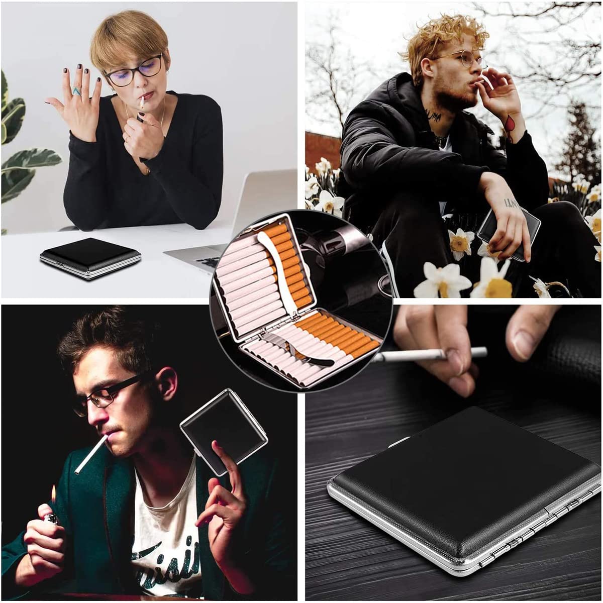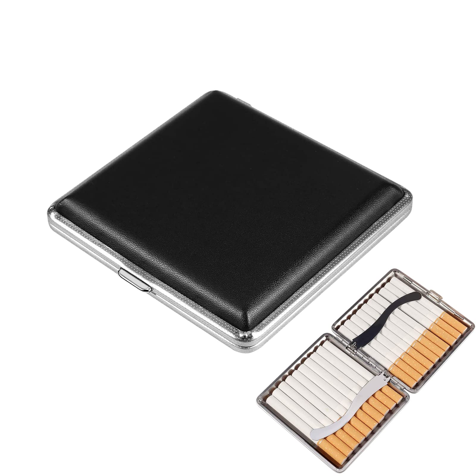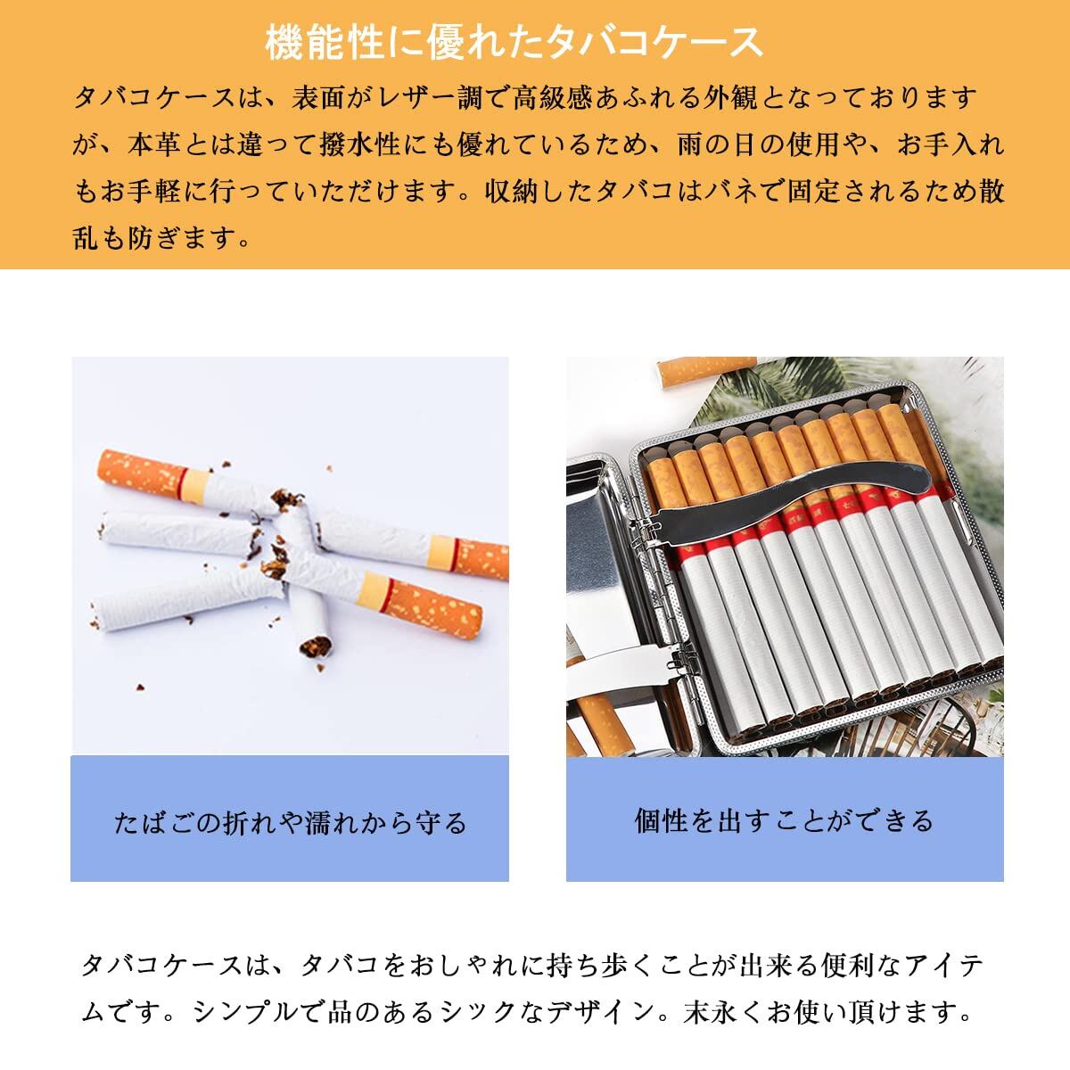 2.機能性に優れたタバコケース:タバコケースは、表面がレザー調で高級感あふれる外観となっておりますが、本革とは違って撥水性にも優れているため、雨の日の使用や、お手入れもお手軽に行っていただけます。収納したタバコはバネで固定されるため散乱も防ぎます。