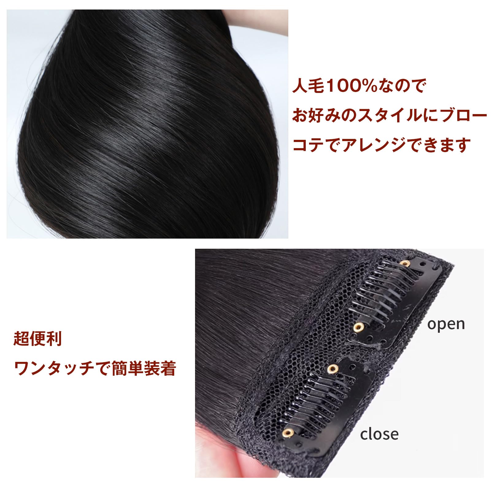 素材:人毛100%。頭頂部や側面部のヘアに悩みがある方、後頭部の絶壁が気になる方必見!!簡単装着!クリップでさむだけでは、瞬間変身!