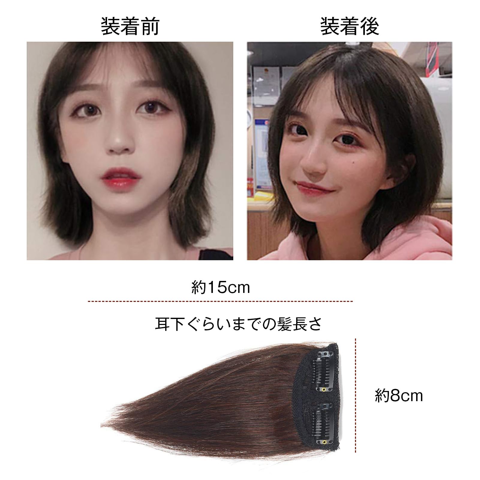 特徴:?色:2色が選べ:自然黒色(ダーク茶色系)落ち着いた栗色(ダークブラウン系) ぶ ?サイズ:3タイプ「①横約5cm*縦約10cm(1pic/set)。②横約8cm*縦約15cm(1pic/set)。③横約8cm*縦約25cm(1pic/set)」 ?クリップ:固定用クリップあり ?重さ:約19g(簡単ボリュームアップ)