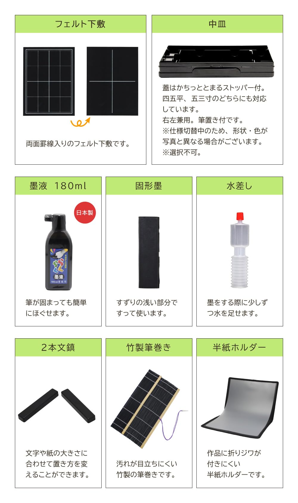【セット内容】・スタンダードな太筆(3号) ・小筆(8号) ・超軽量プラスチック硯(四五平・研磨剤入り) ・墨 ・墨液 ・文鎮2本組 ・罫線入り下敷き ・筆巻 ・水差し ・中皿 ・半紙ホルダー ・ショルダーベルト