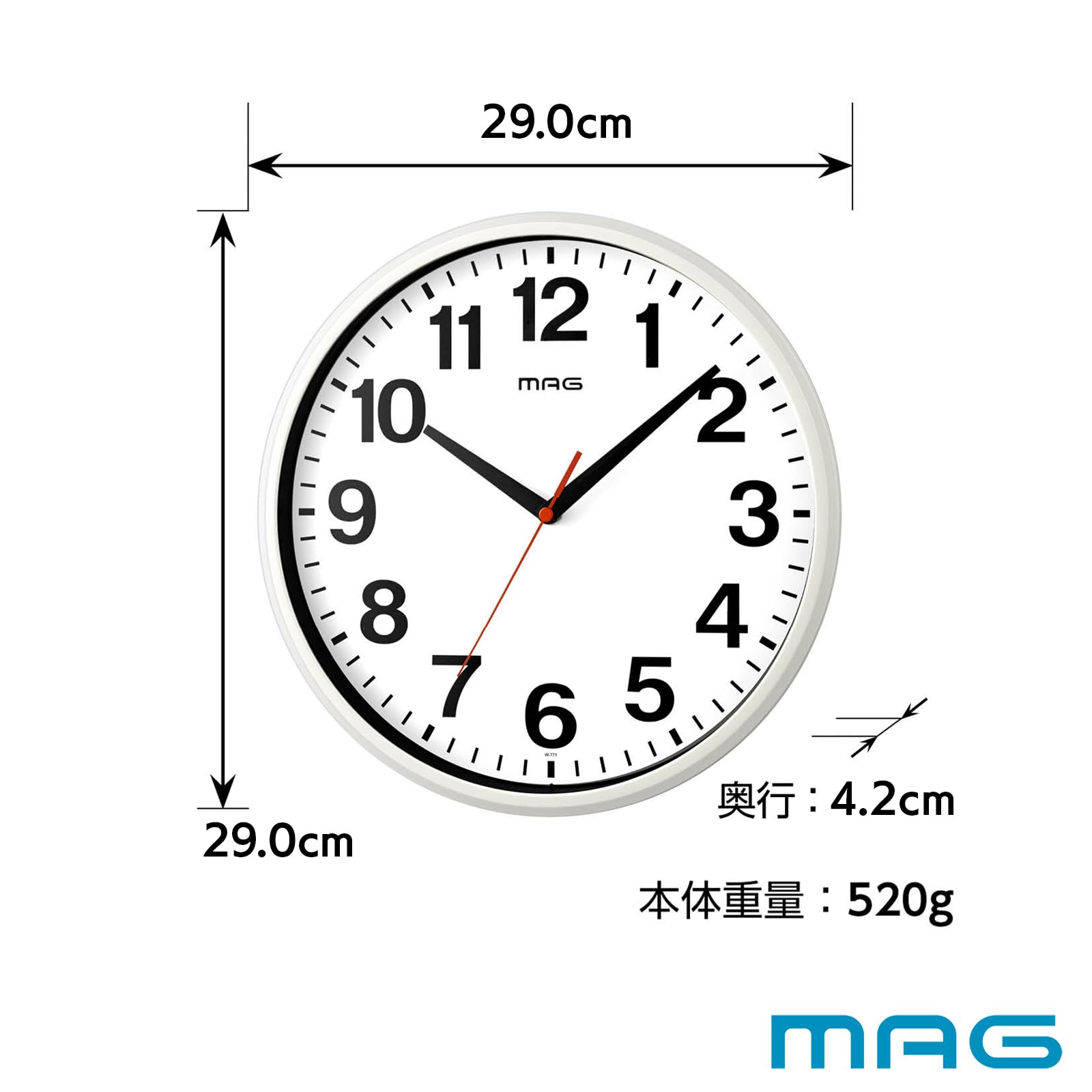 【在庫のみ】MAG(マグ) 掛け時計 壁掛け時計 アナログ 静音 連続秒針 直径29.0㎝ シンプル おしゃれ ホワイト シューレ W-771 WH-Z ノア精密