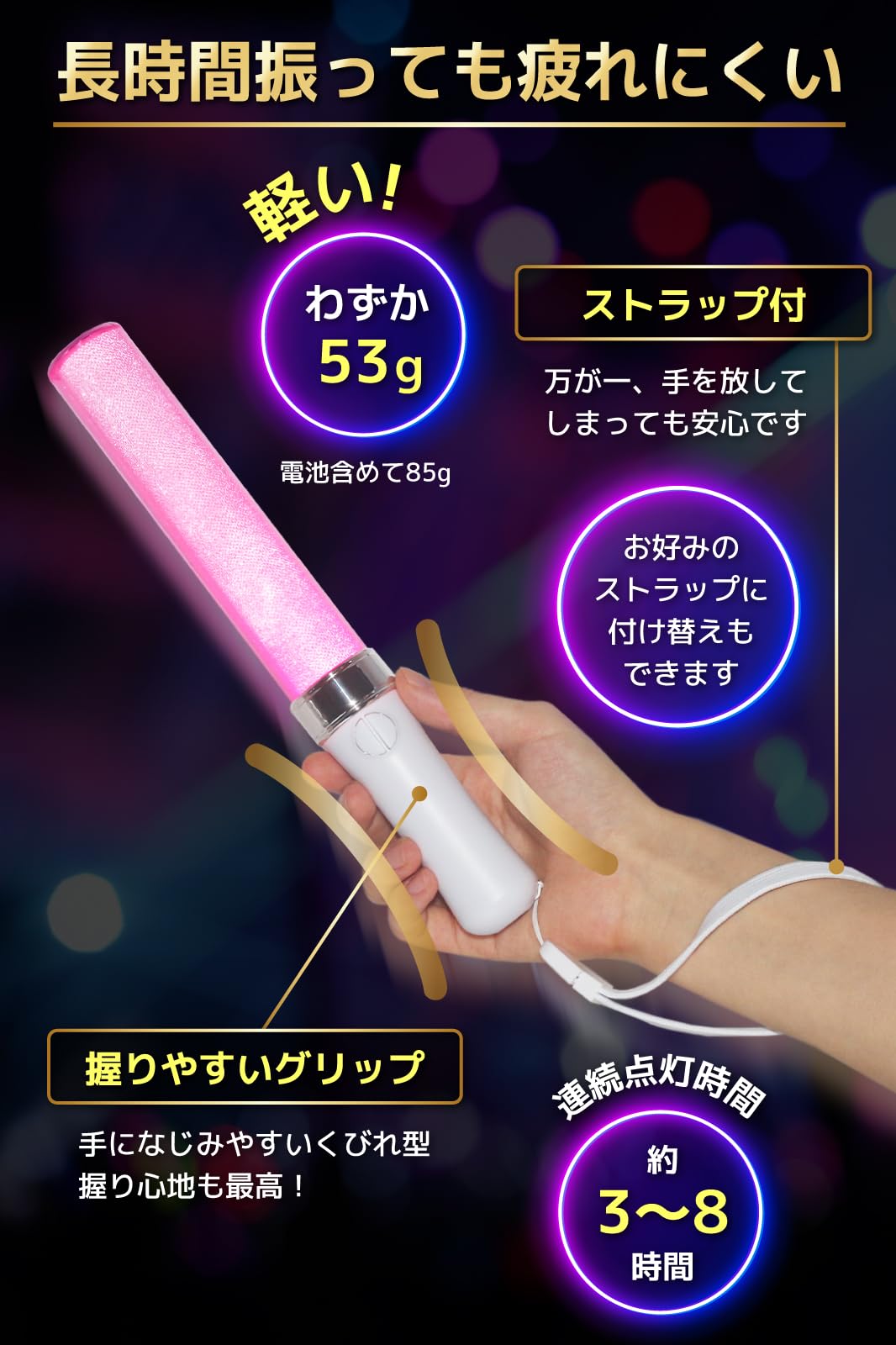 【落下防止】 落下防止用にストラップがついています。手にしっかり通すことで、振った勢いでペンライトを落とす心配がなくなります。 ※お好みのストラップに付け替えも可能です。