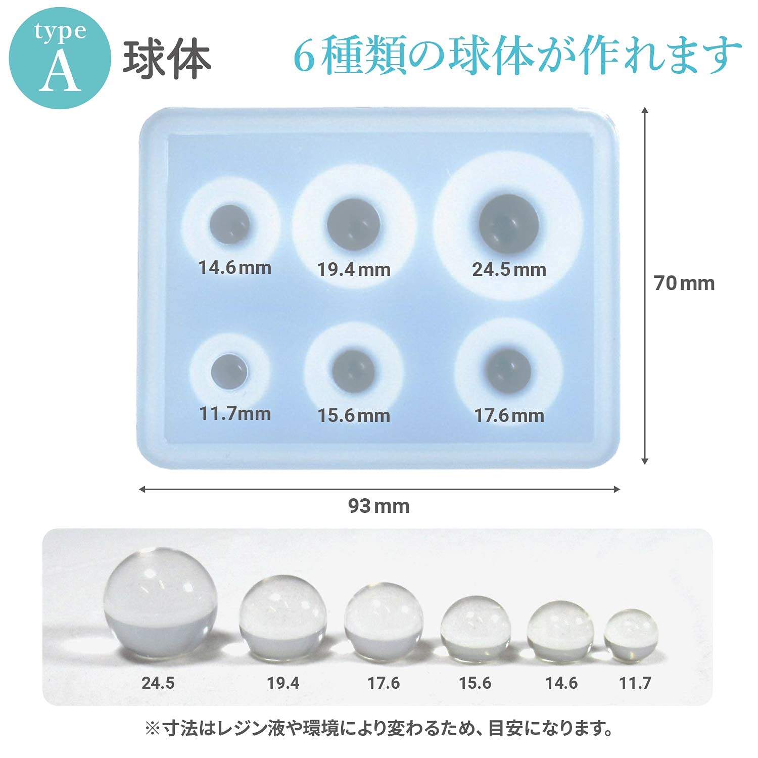 レジンで使用できる、シリコンモールドで、6種類の球体を作る事ができます。